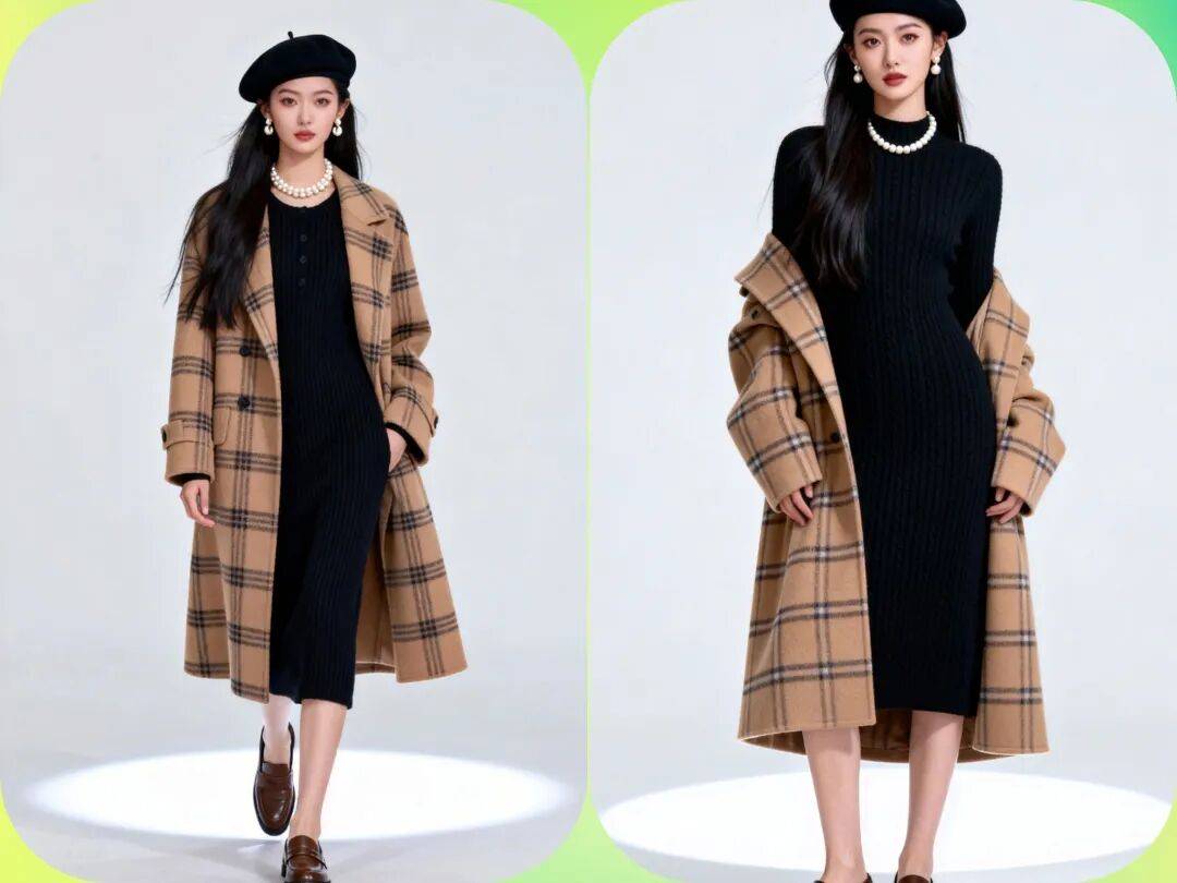 流行趋势:针织裙+格纹大衣的组合重回潮流,珍珠饰品和贝雷帽是加分项。