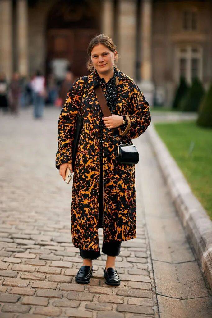 宽松的长款大衣外套在橙黄色和黑色等色彩的对比中,带来了撞色冲击的花纹活力,为大衣增加了更多的野性气质,以宽松直筒裤和平底鞋搭配,也多了利落休闲感。