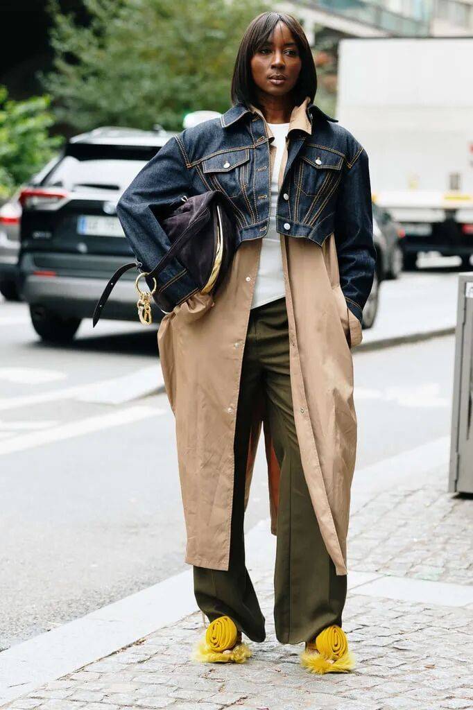 白色的休闲内搭和长款卡其色大衣的搭配,在短款牛仔外套的搭配中,让层次分明清晰,搭配中,黄色的鞋子多了一些特色的造型。