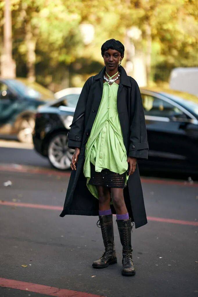 黑色的长款裙装与黑色的直筒裤的搭配打造了更多黑色颜色的沉稳大方,宽松廓形的舒适,在和平底鞋的搭配多了休闲利落感,以卡其色的宽松大衣多了一些层次休闲。