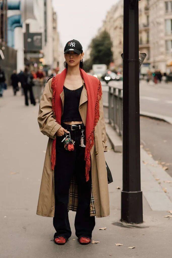 黑色的休闲内搭在和卡其色大衣之间的搭配中,增加了层次和气质,以红色的围巾搭配,增加了装饰细节,也和搭配的红色鞋子之间多了色彩呼应。