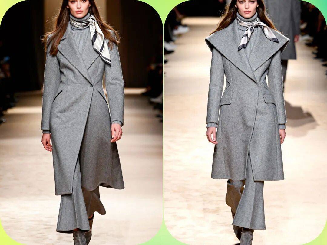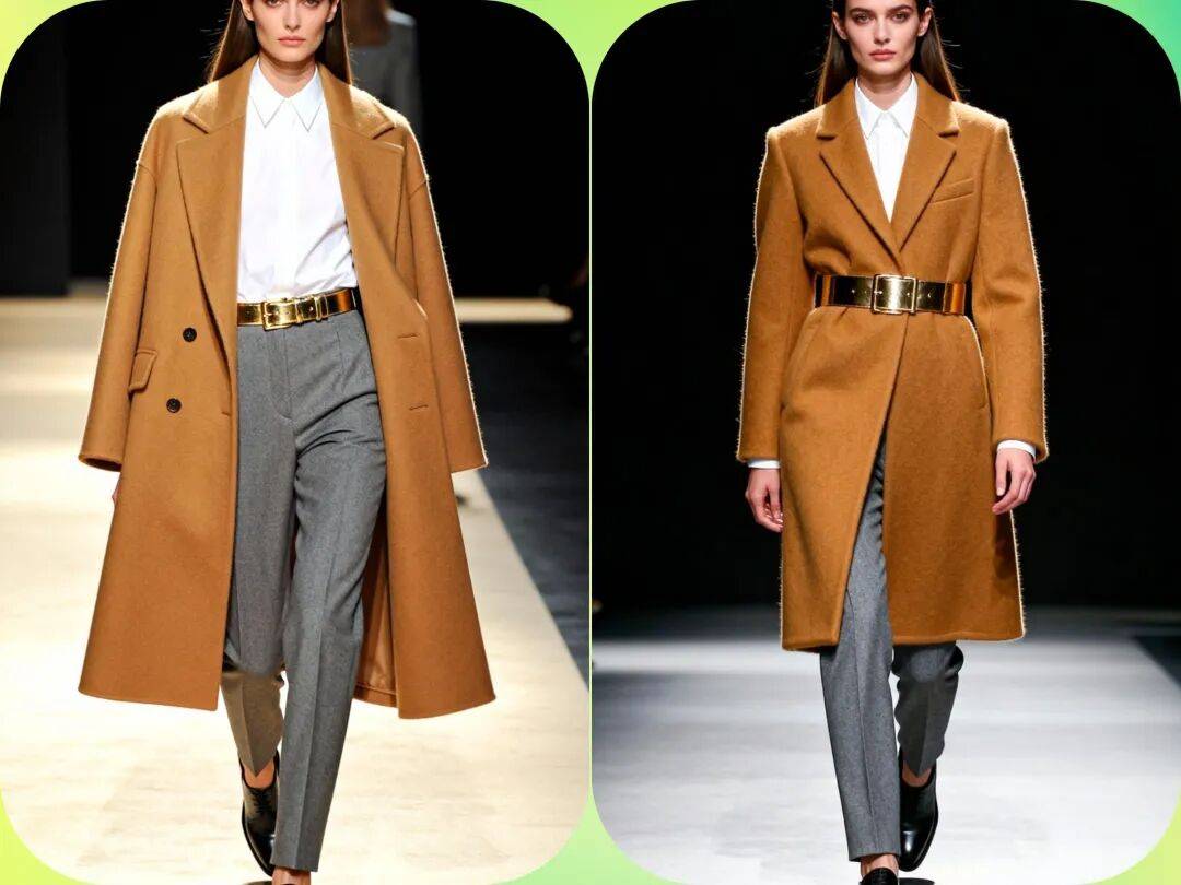 流行趋势:本季流行中性色大衣(如驼色、灰色)搭配微喇裤或阔腿西装裤,强调线条感。