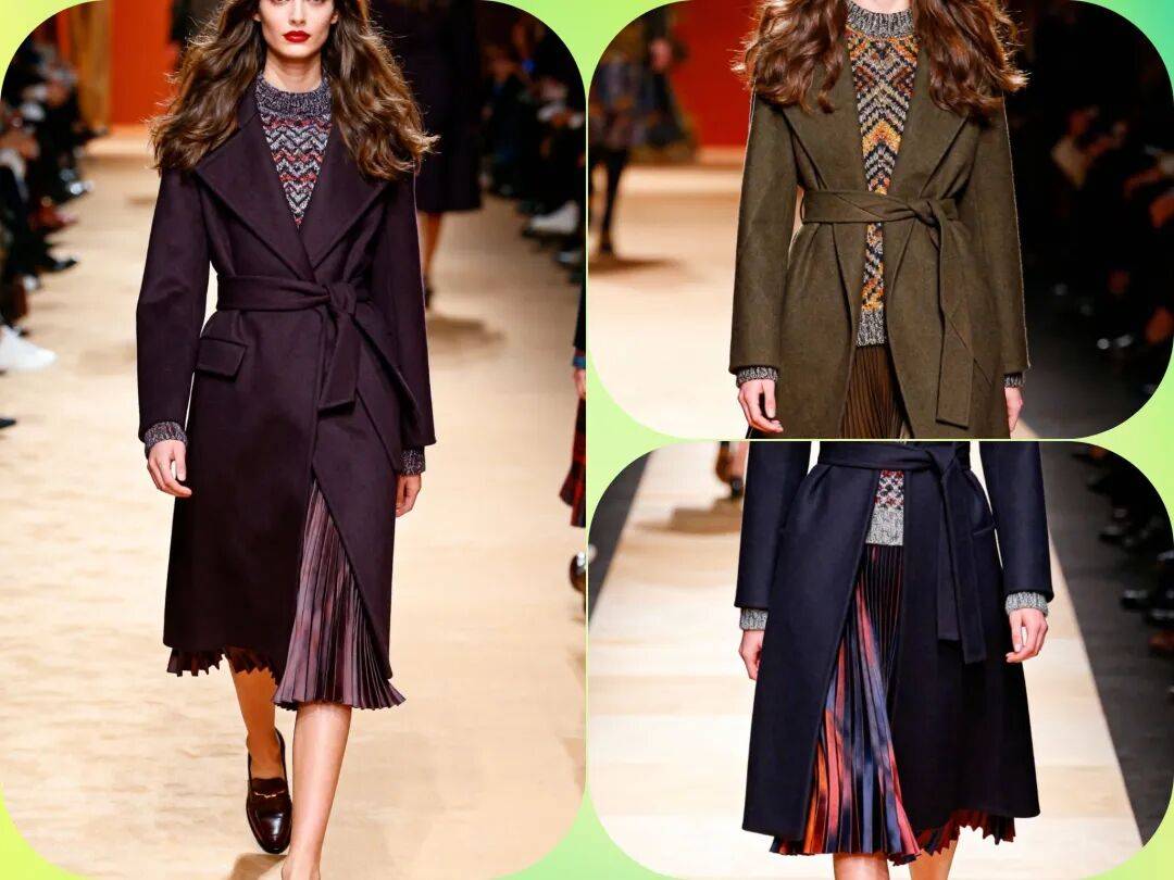搭配公式:系带款毛呢大衣(X型)+ 针织连衣裙/百褶半裙 + 长靴/乐福鞋