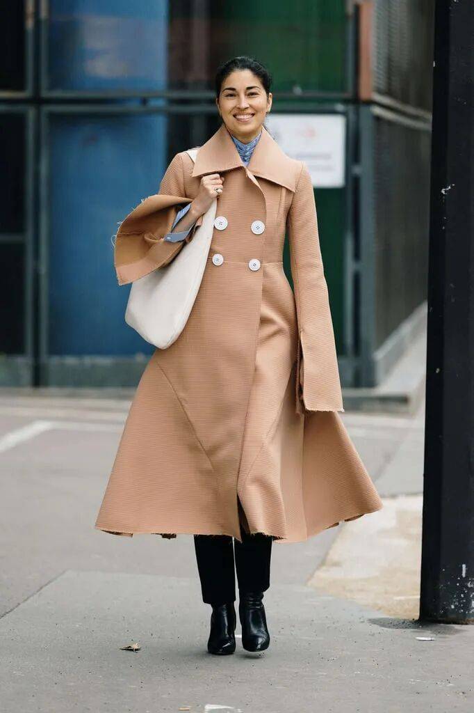 搭配方式:厚实材质的大衣(如双面呢)搭配高领毛衣和 oversized 围巾,下装选择加绒裤或阔腿裤,脚穿雪地靴或厚底靴。