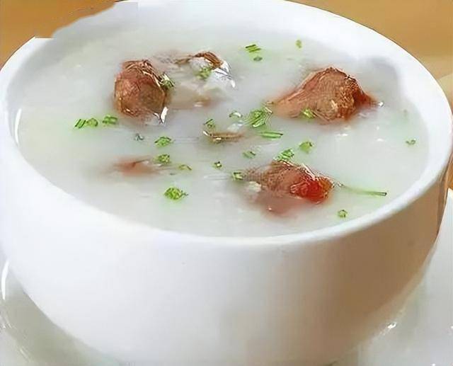 图片2:白色粥+肉块+绿色葱花(可能是羊骨粥的简化版)
