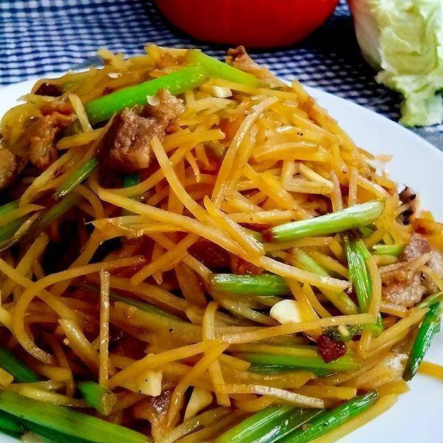 图片:图片4(炒土豆丝+绿色葱段+棕色肉片)