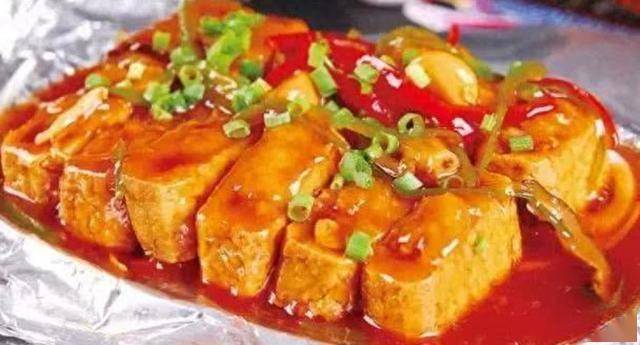 图片11:豆腐块+红色酱汁(可能是铁板客家豆腐或红烧豆腐)