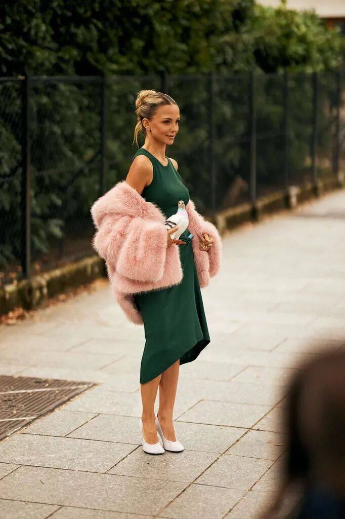 无袖的吊带连衣裙在和修身设计的结合多了一些休闲日常,而浅粉色的皮草外套的搭配也多了少女感的粉嫩。