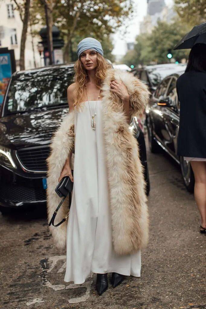 抹胸的白色连衣裙在宽松廓形的线条上,以棕色毛绒的皮草披肩的搭配,增加一些装饰细节感。