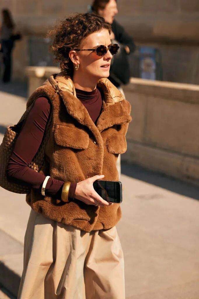 短款皮草:提升腰线,适合搭配高腰阔腿裤或无痕裤,小个子也能轻松驾驭