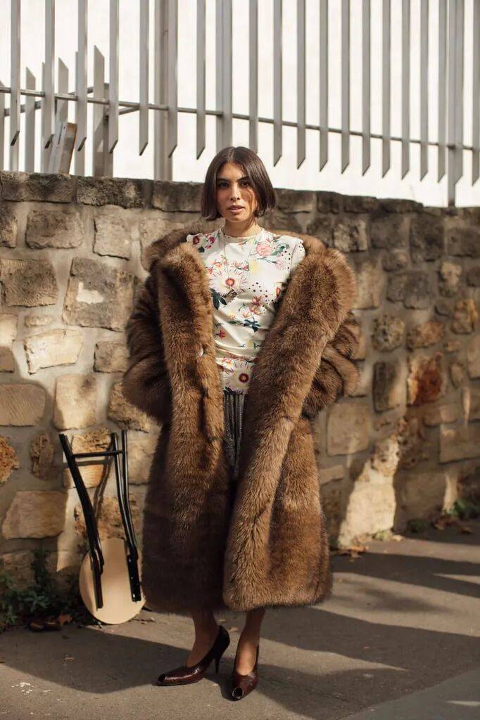 棕色的长款大衣在毛绒的皮草材质上,在和花纹内搭的搭配,多了活力和层次时尚。