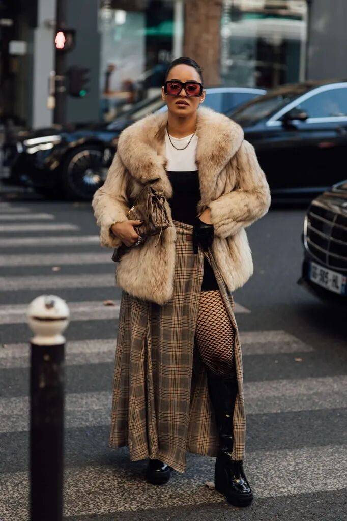 皮草的外套和开叉的格纹裙装进行搭配,也多了一些复古的优雅,在开叉位置以网格丝袜的搭配,多了几分小性感。