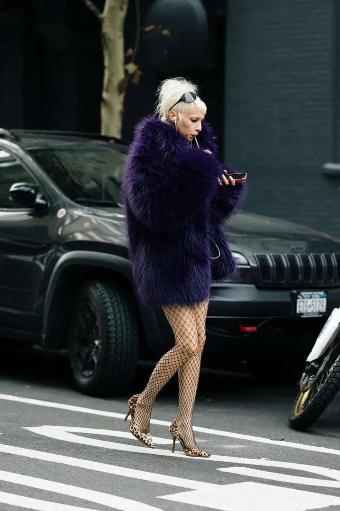 深紫色的皮草服装在蓬松厚实的材质中,以网纹丝袜的搭配,也多了一些质感对比,增加了一些性感的女性魅力。