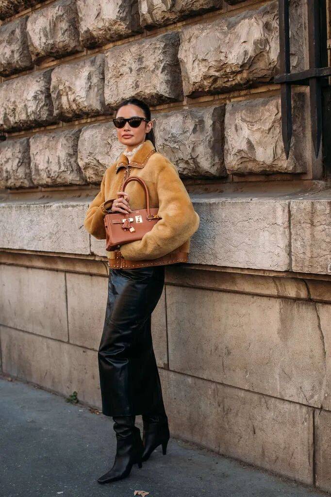 棕色的休闲皮草外套在日常的酷帅时髦中,搭配黑色的皮革直筒裙,色彩的对比在百搭中也有一些面料的对比冲击。
