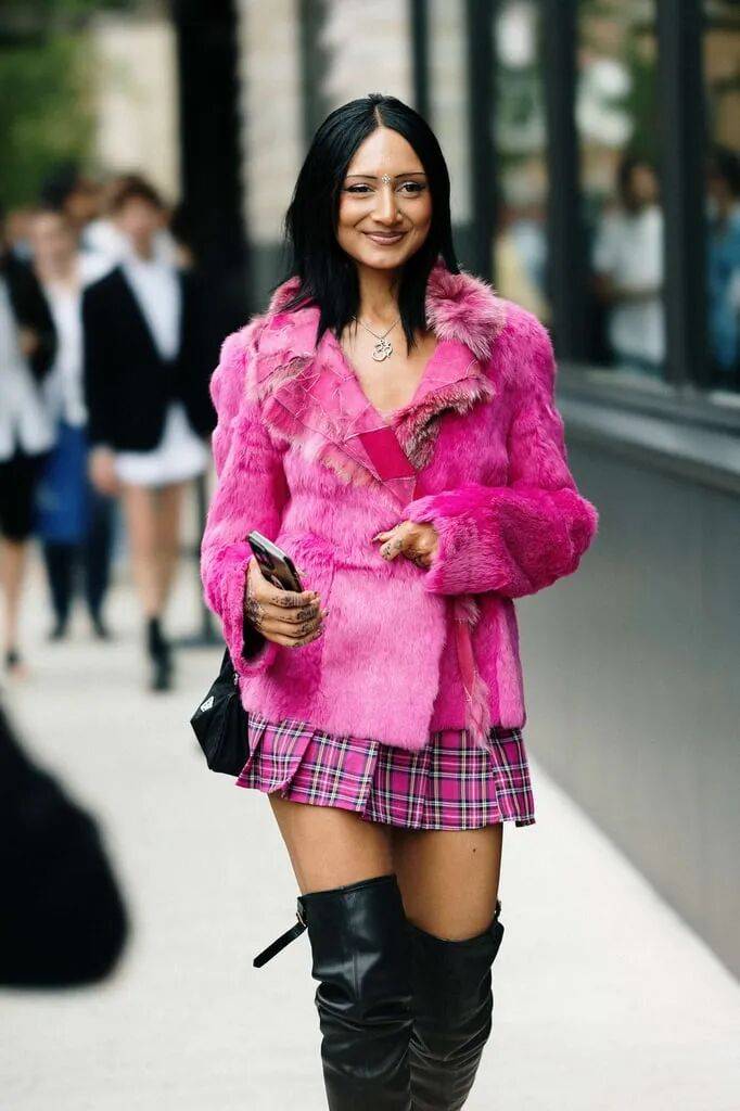 鲜艳的洋红色的毛绒皮草上衣外套以同色系的格纹褶裙进行搭配,在色彩呼应中也带着一些色彩差异的对比感。
