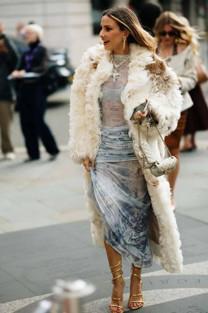 亮片裙在裙装款式的优雅中,增加了亮片元素的光泽纹理质感,在和白色的毛绒皮草外套的结合搭配,更多了一些层次和质感的高级感。