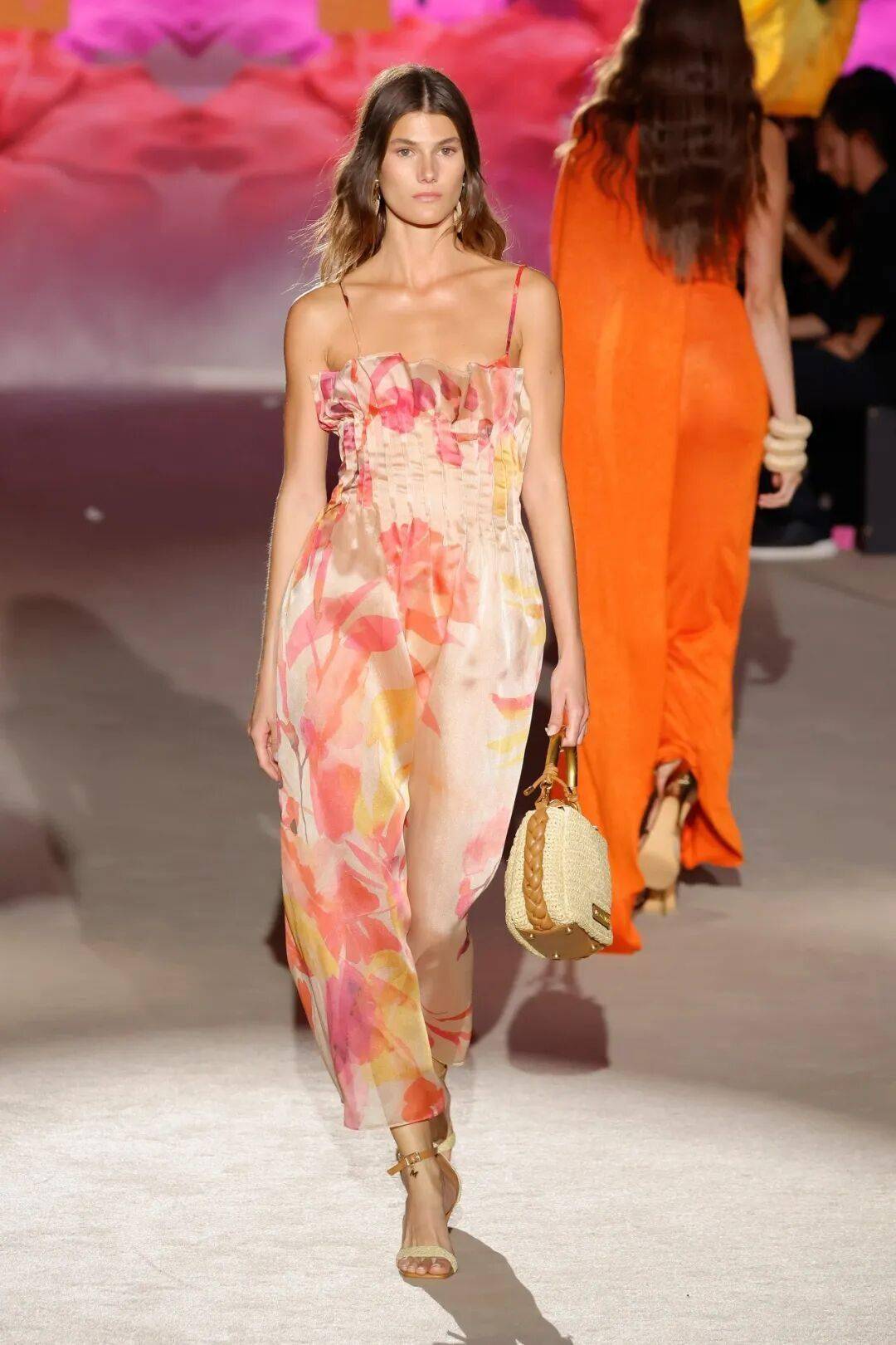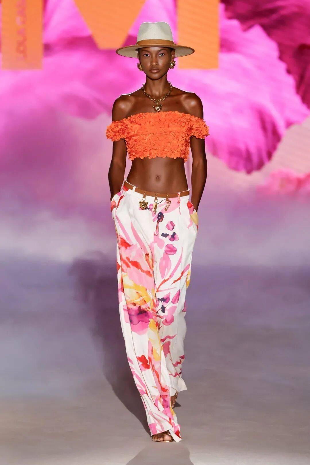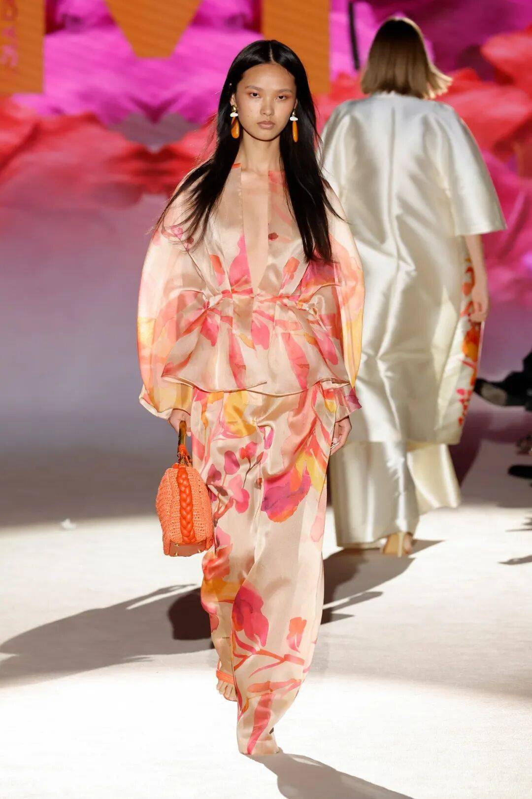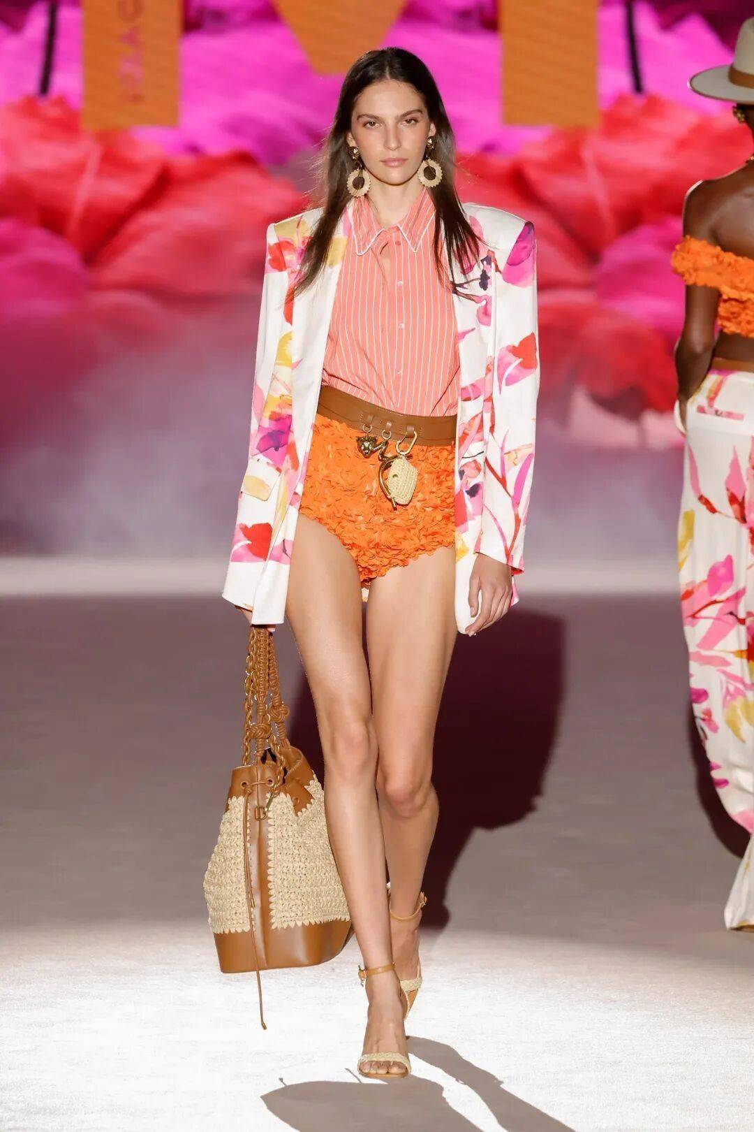 甜瓜橙(Melon Orange):贯穿于丝质衬衫与工装风连体裤,传递活力基调