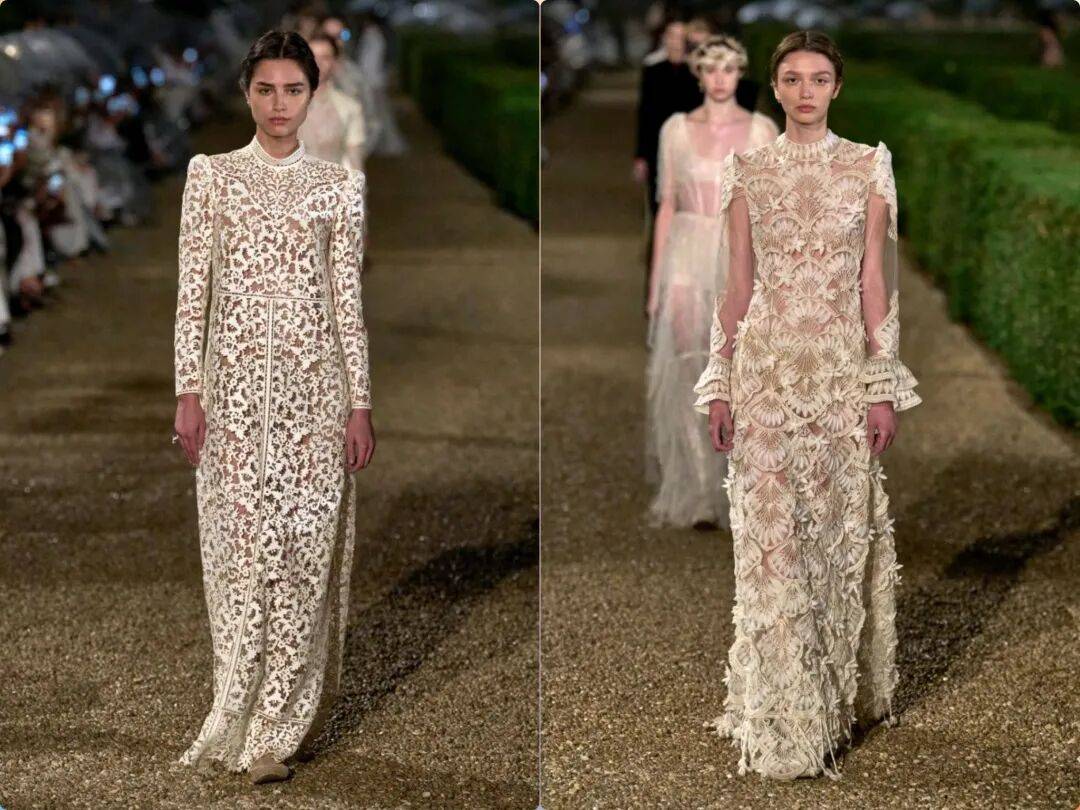 载体符号:蕾丝、薄纱等传统女性化材质与金属锁子甲工艺碰撞,如银色手工金属连衣裙以冷光呼应记忆的永恒性,同时通过拉菲草编织肌理传递自然流逝感。