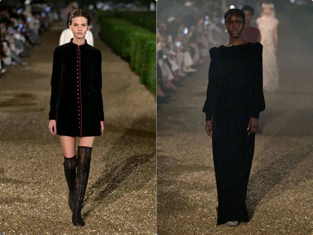 在优雅的连衣裙上,深色颜色在暗色调颜色中也多了几分低调的稳重气质,在丝绒和色彩中,也多了一些高级奢华的时髦,还在同色系的不同颜色之间形成了对比,为裙装增加暗纹的低调优雅,裙装结合了露肩的设计,将一些视线集中在肩袖位置,打造吸睛的亮点。