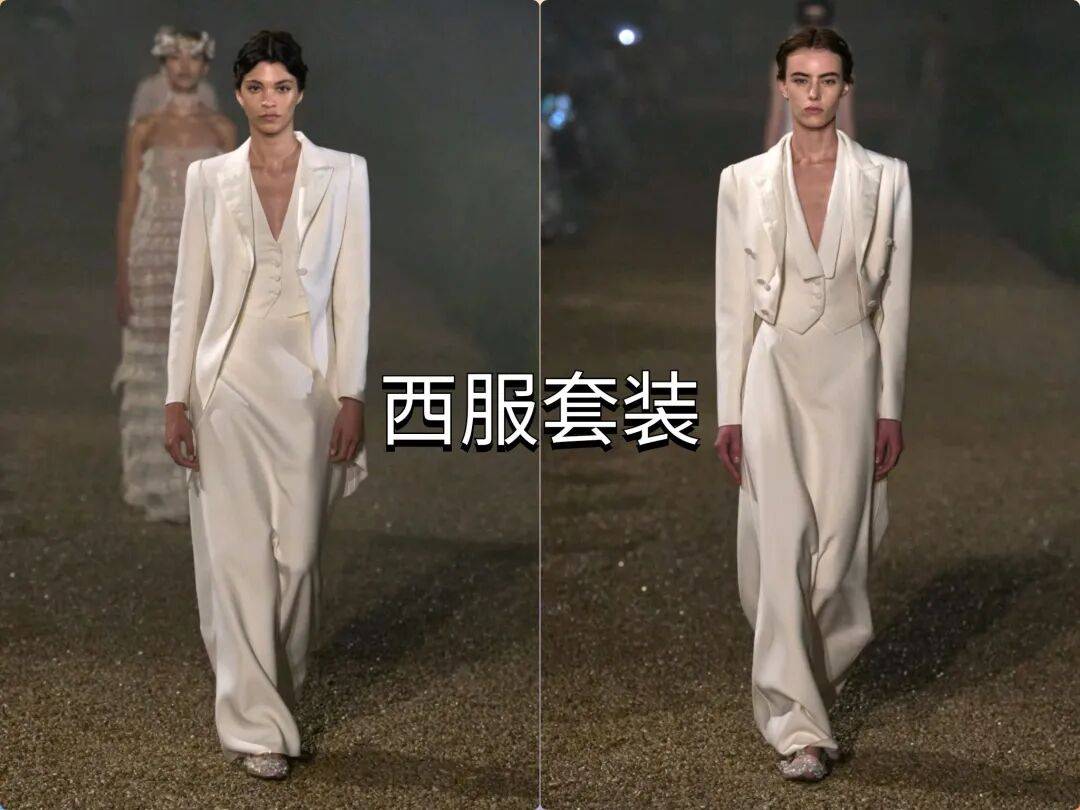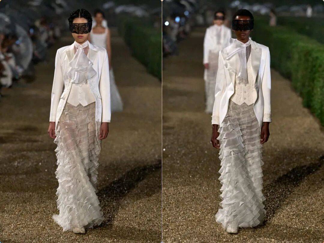 白色的西服外套在和马甲的搭配多了干练层次感,领口以薄纱的打结系带,增加立体细节的甜美,以薄纱裙装进行搭配,增加层次和朦胧视觉。