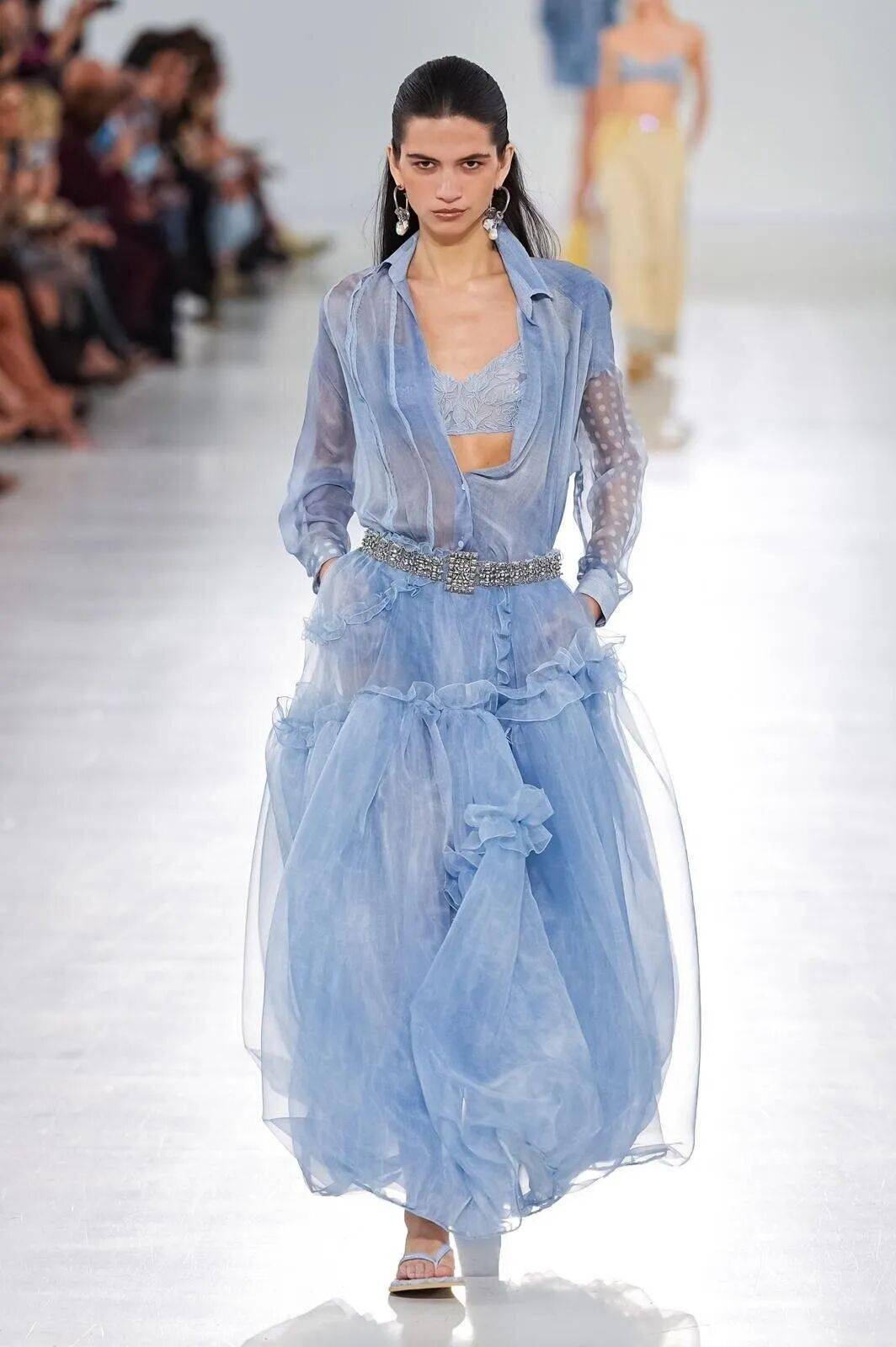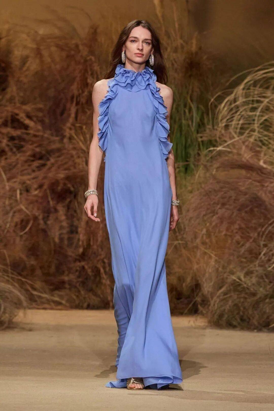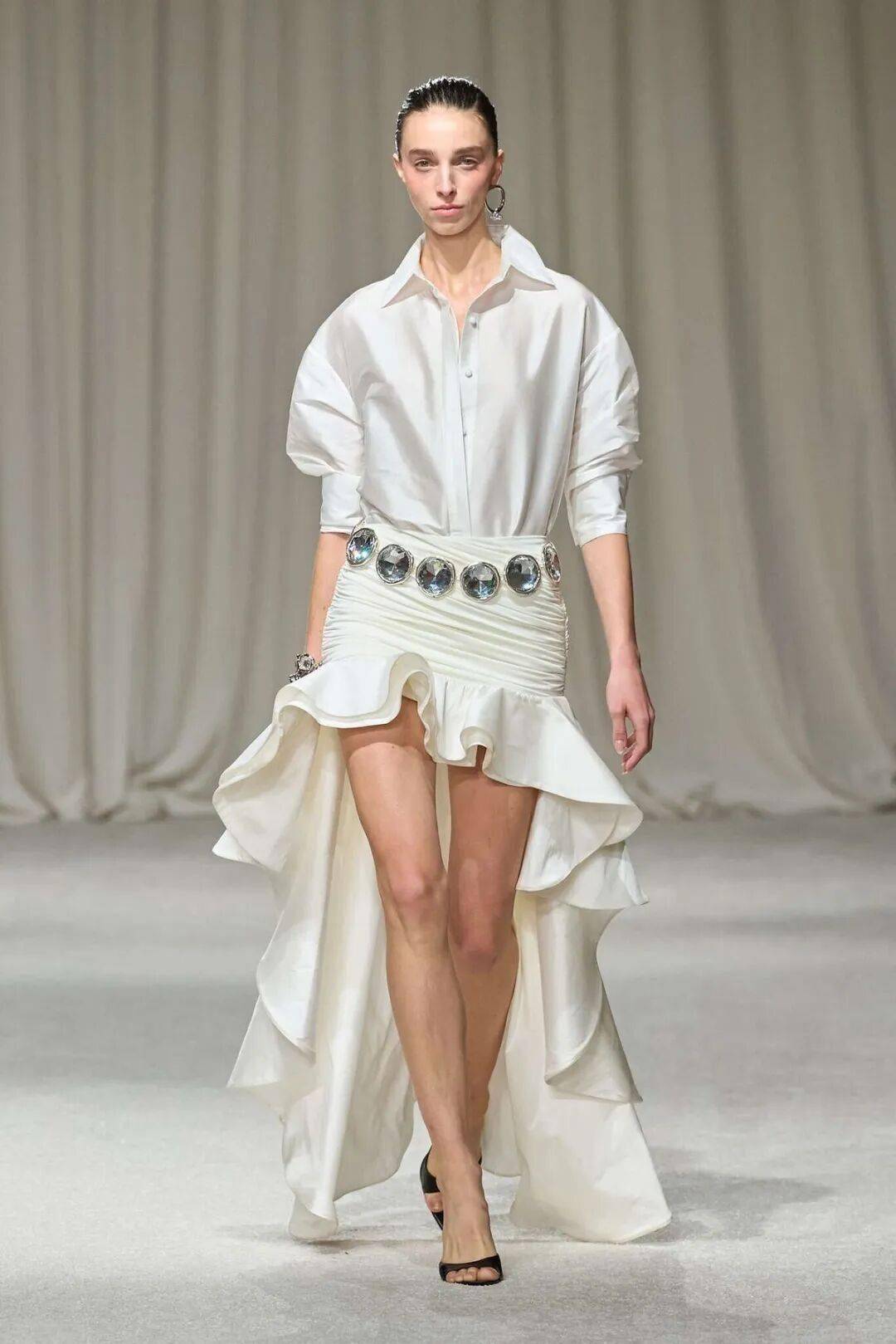 通过高科技尼龙、真丝欧根纱等材质,实现视觉体积与重量的分离,如空气雕塑般飘逸。
