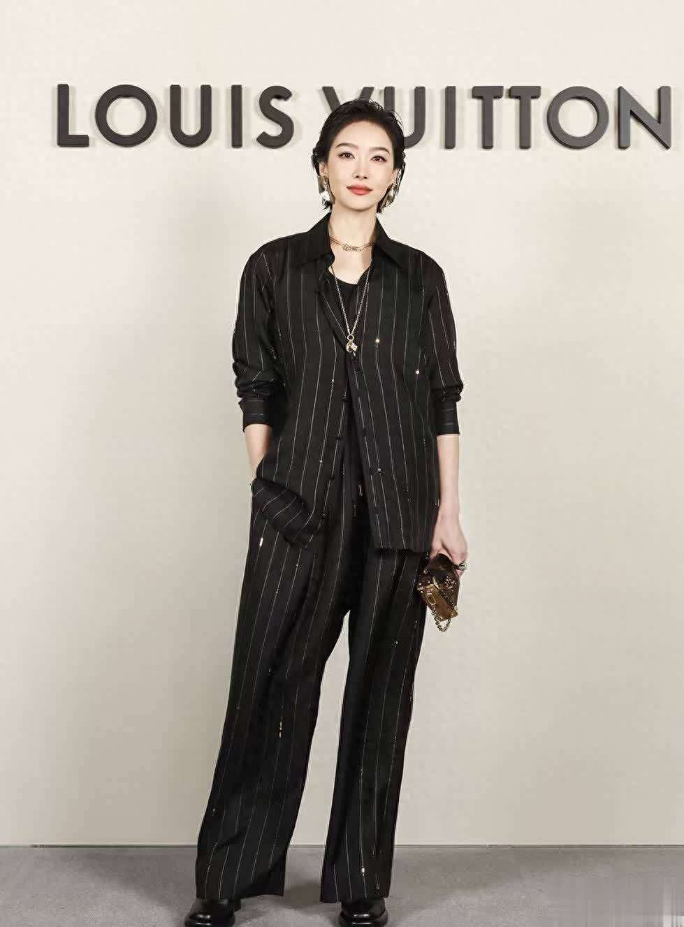 宋茜以一身黑色竖条纹衬衫套装亮相,简单的黑白配色却通过金属配饰如耳环、项链等细节展现出不凡的品位。她的大背头发型与这身利落、干练的造型相得益彰,整体看起来既飒爽又充满了都市女性的自信与力量感,真是美得无可挑剔。