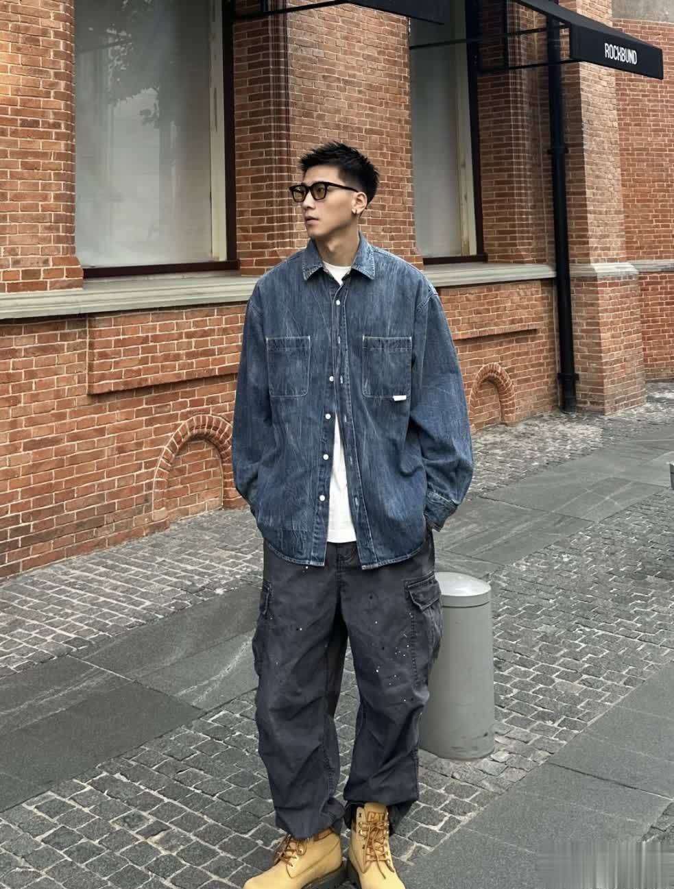 王鹤棣身高优势明显,因此他选择了一件长款衬衫搭配风衣和工装裤,深沉的大地色系使得整体看起来复古又摩登。蓝色的大包包与卡其色的搭配相得益彰,让人感受到他对细节的精准把控,优雅且不失个性。