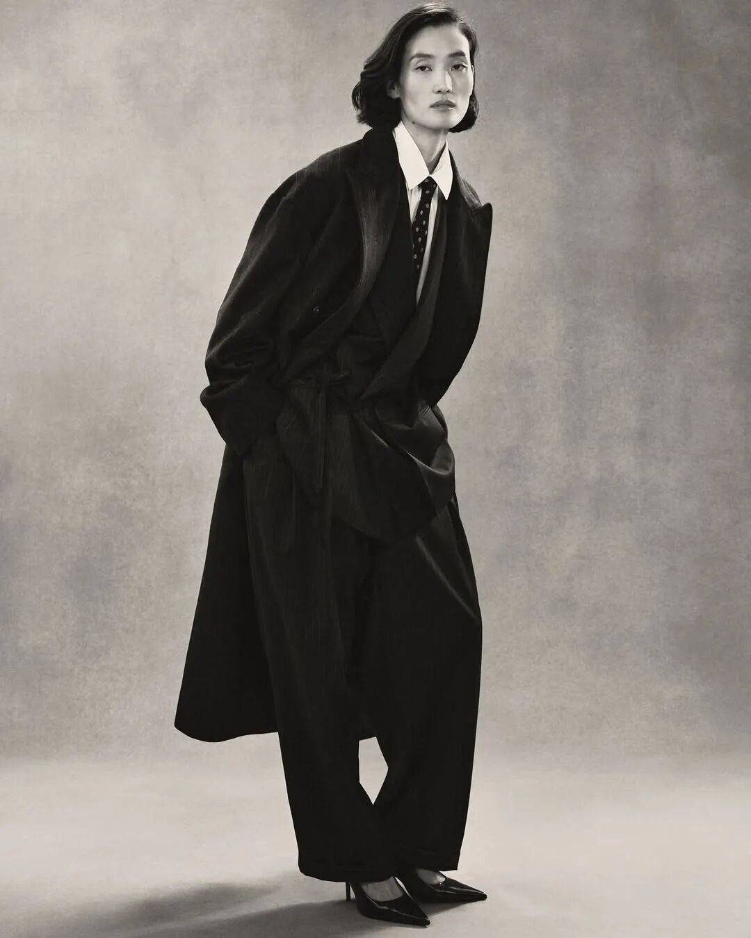 表现形式: 系统性调整经典西装比例(外扩肩线、拉长衣身),在保留正装结构的同时为裤装注入更多松量与褶量。核心在于回应“身体如何移动”,为行走、转身、坐下等真实动态预留空间。