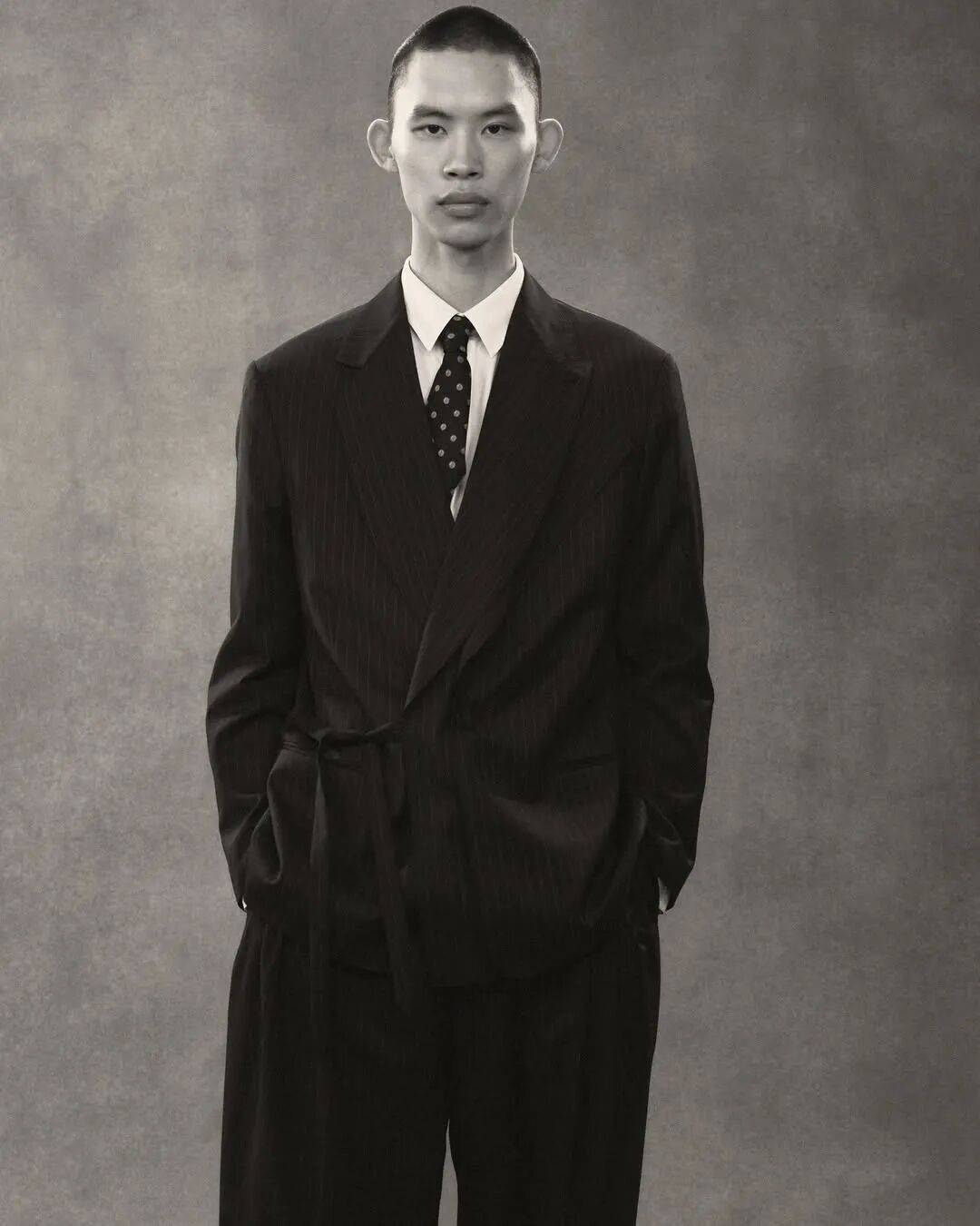 在他的设计中,西装比例被系统性地重新调整:肩线外扩、衣长拉长,裤装在保留正装结构的同时引入更多松量与褶量。