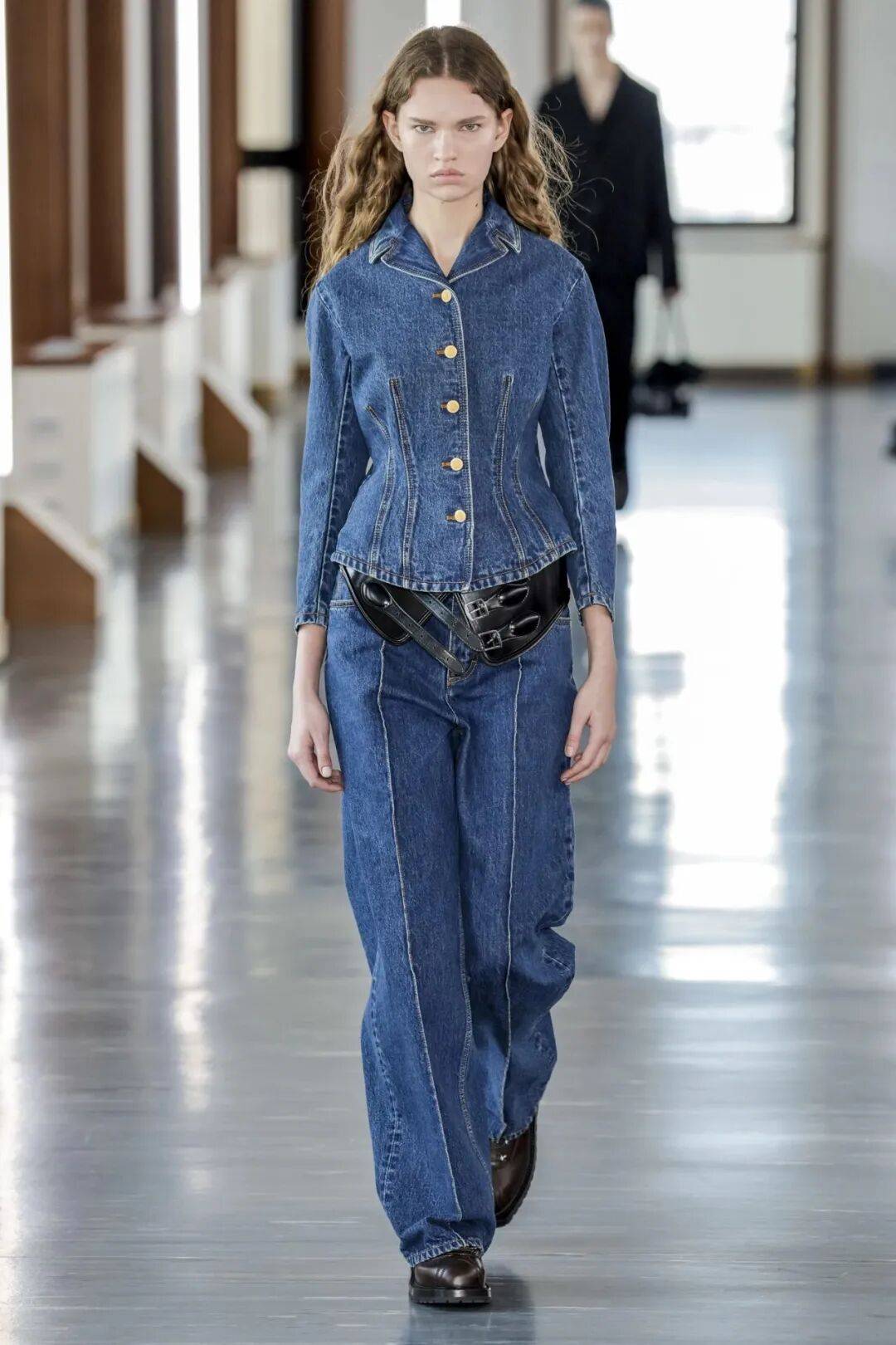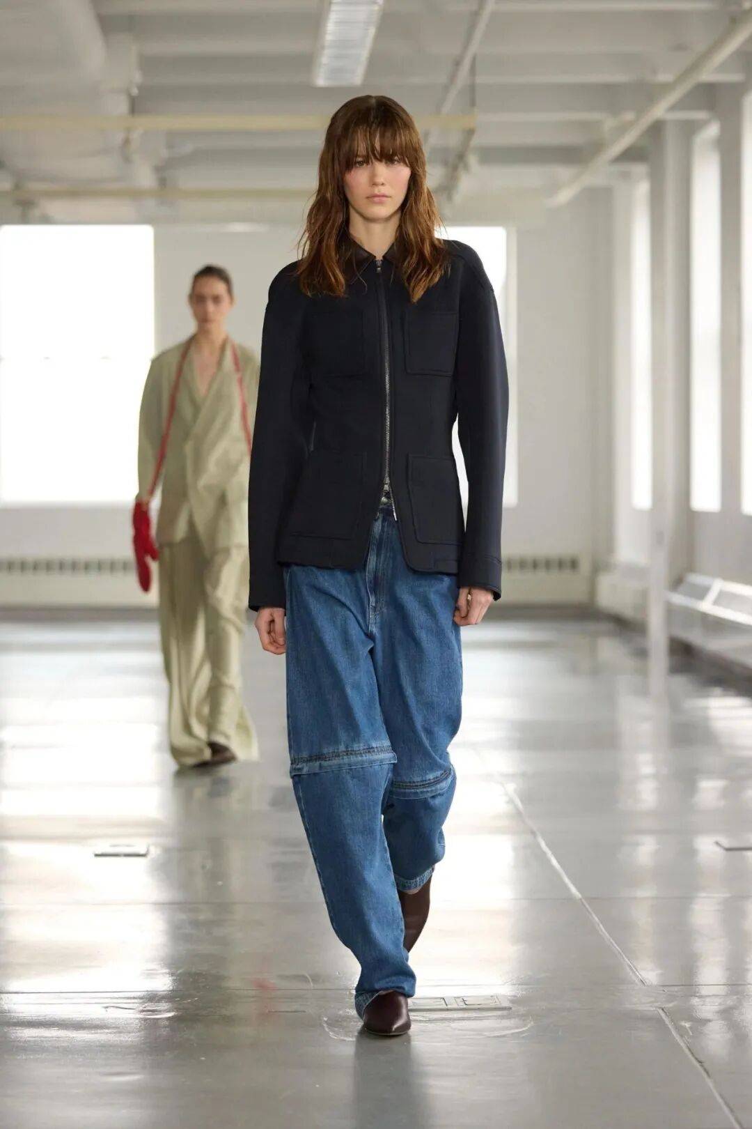 • 材质碰撞:绒面棕色靴配硬挺原色牛仔,或亮皮乐福鞋搭配做旧水洗牛仔,层次感立现。