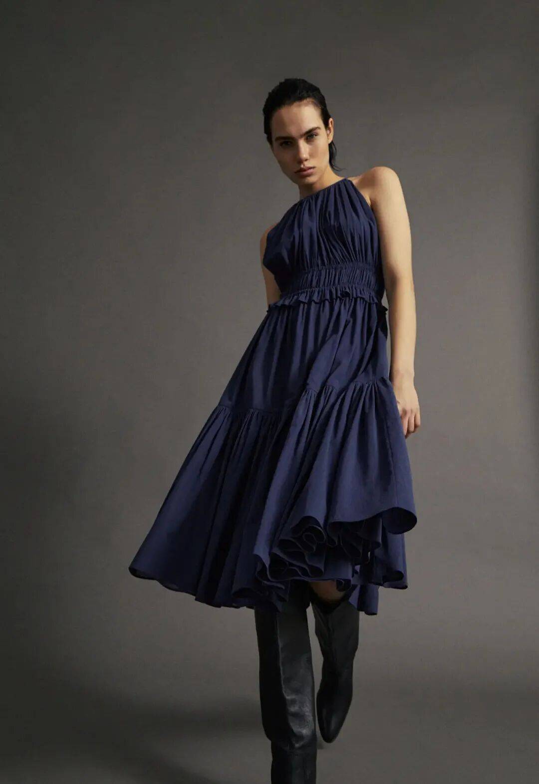 保留了蓝色系的沉静深邃,日蚀蓝是这一季的 “气质底色”。搭配撞色条纹、蕾丝面料或极简廓形,能让穿搭在轻氧氛围里透出沉静前卫的格调,诠释熟女的自信优雅。