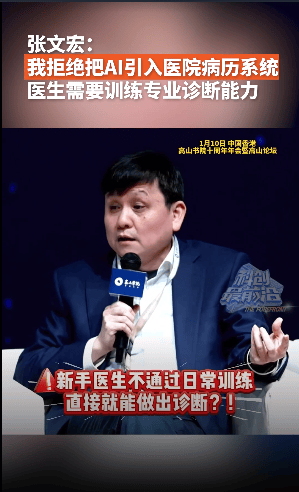 场景:1月10日香港高山书院十周年论坛上,国家传染病医学中心主任张文宏明确表示,反对将AI作为“标准配置”直接参与医院日常诊断。