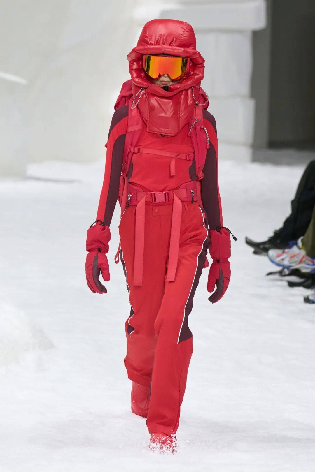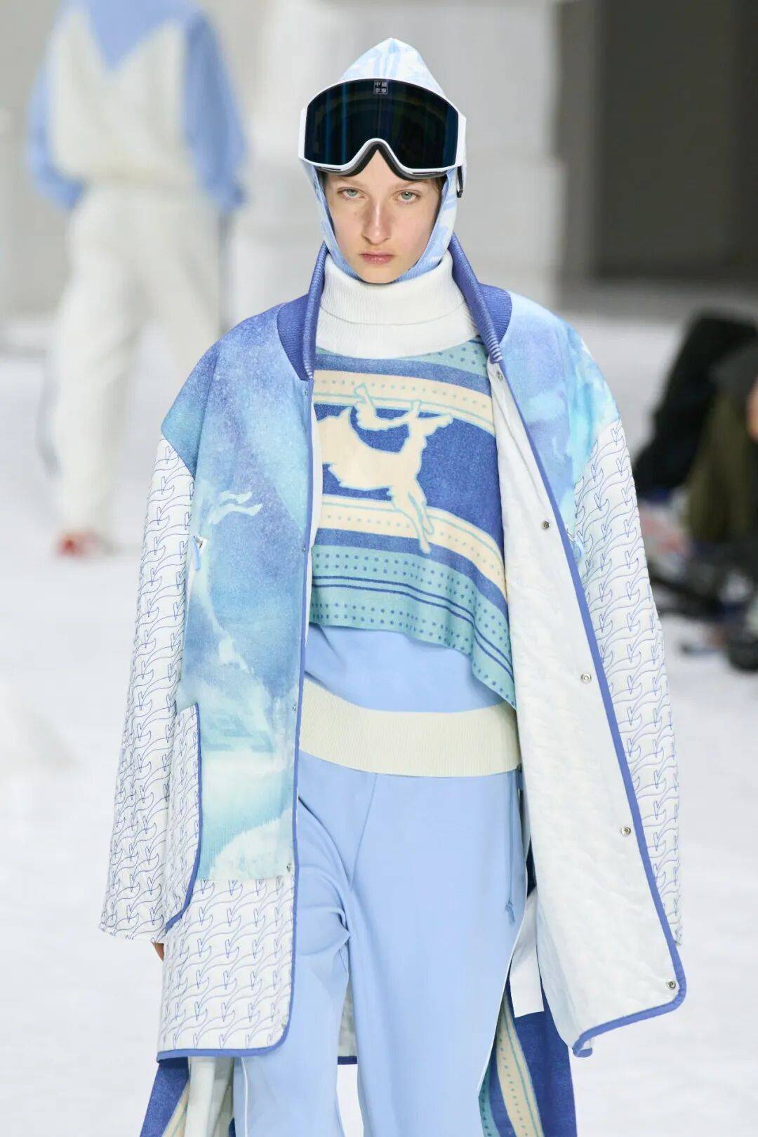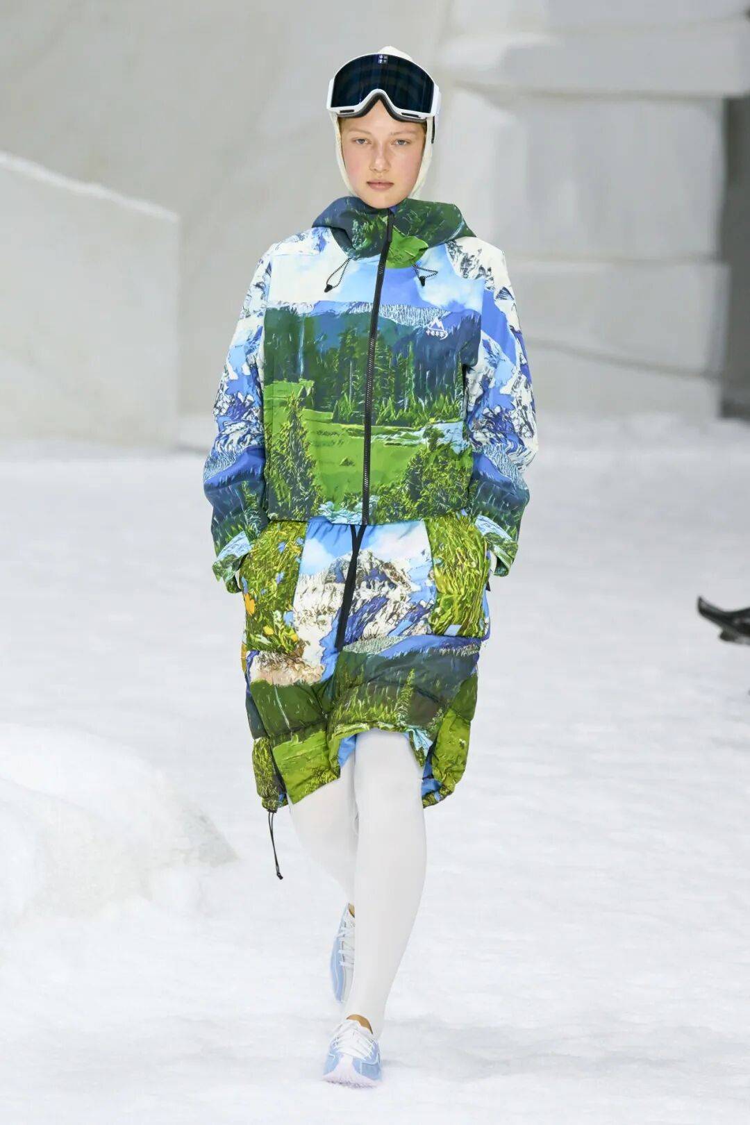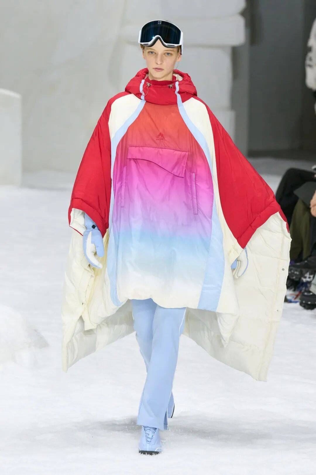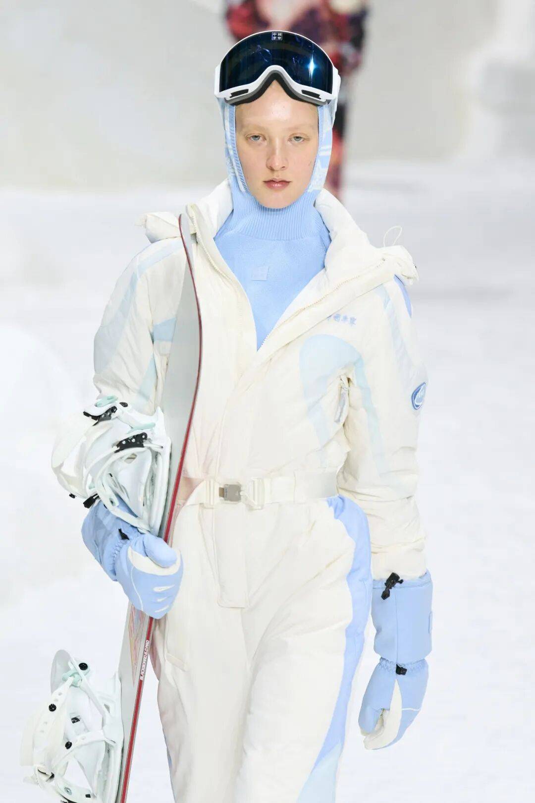 冰川纹理:通过银灰渐变提花面料、半透明TPU压层工艺,模拟冰山裂隙的立体感;服装裁片采用几何切割设计,呼应冰川崩解意象。