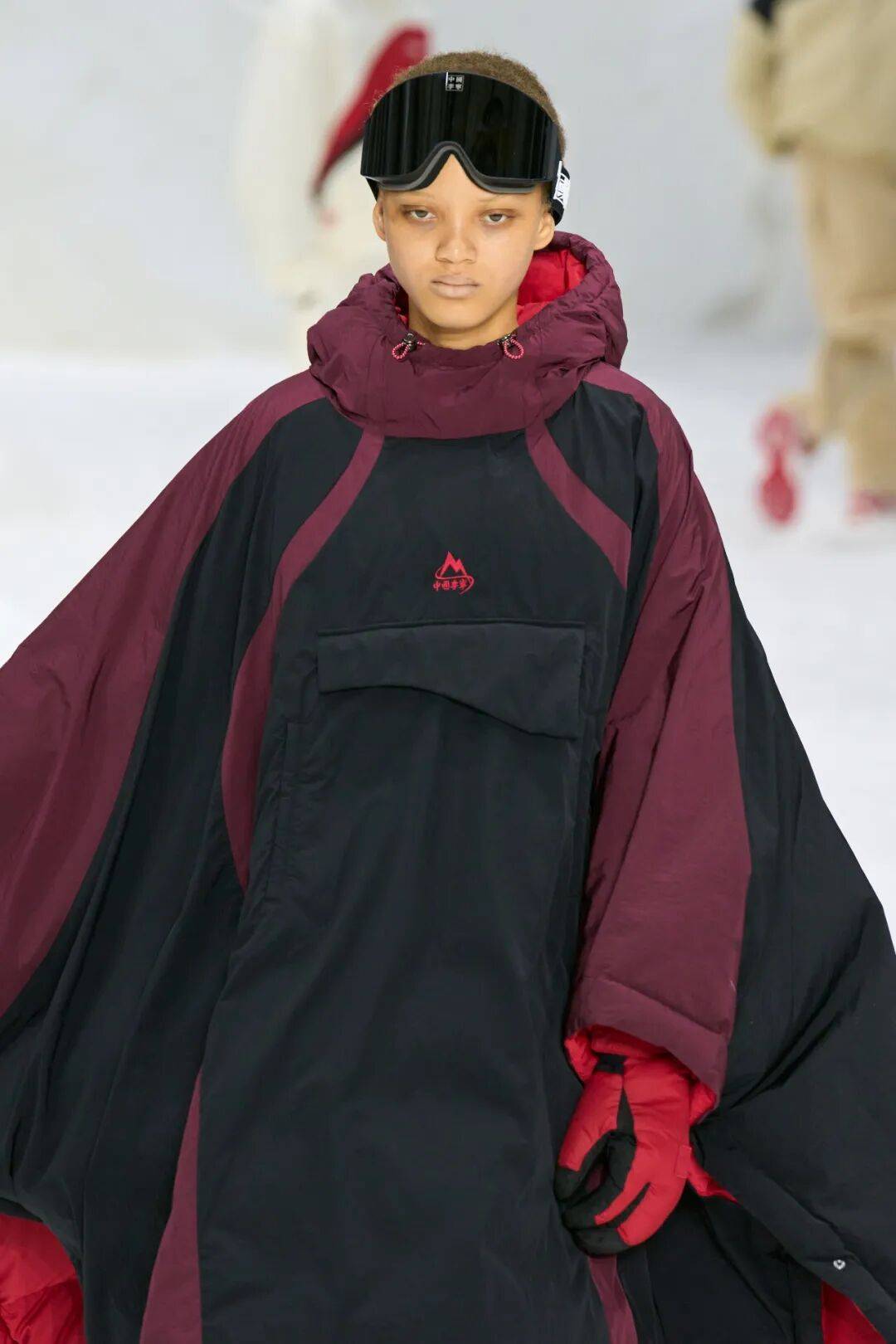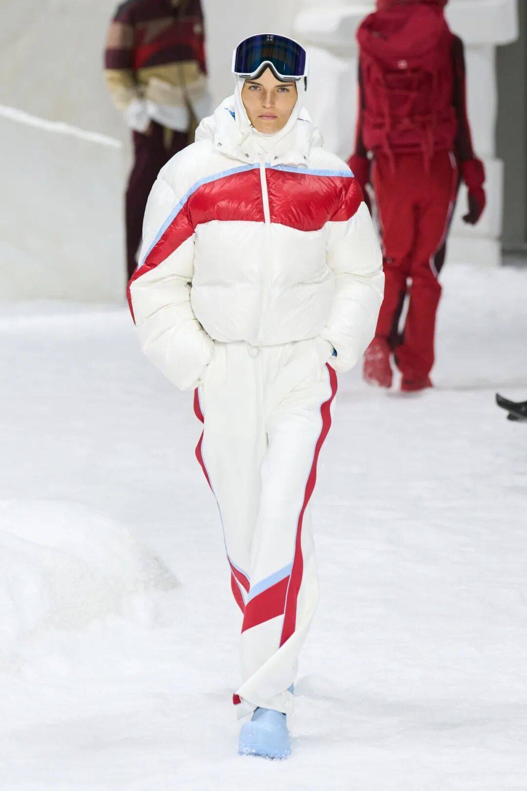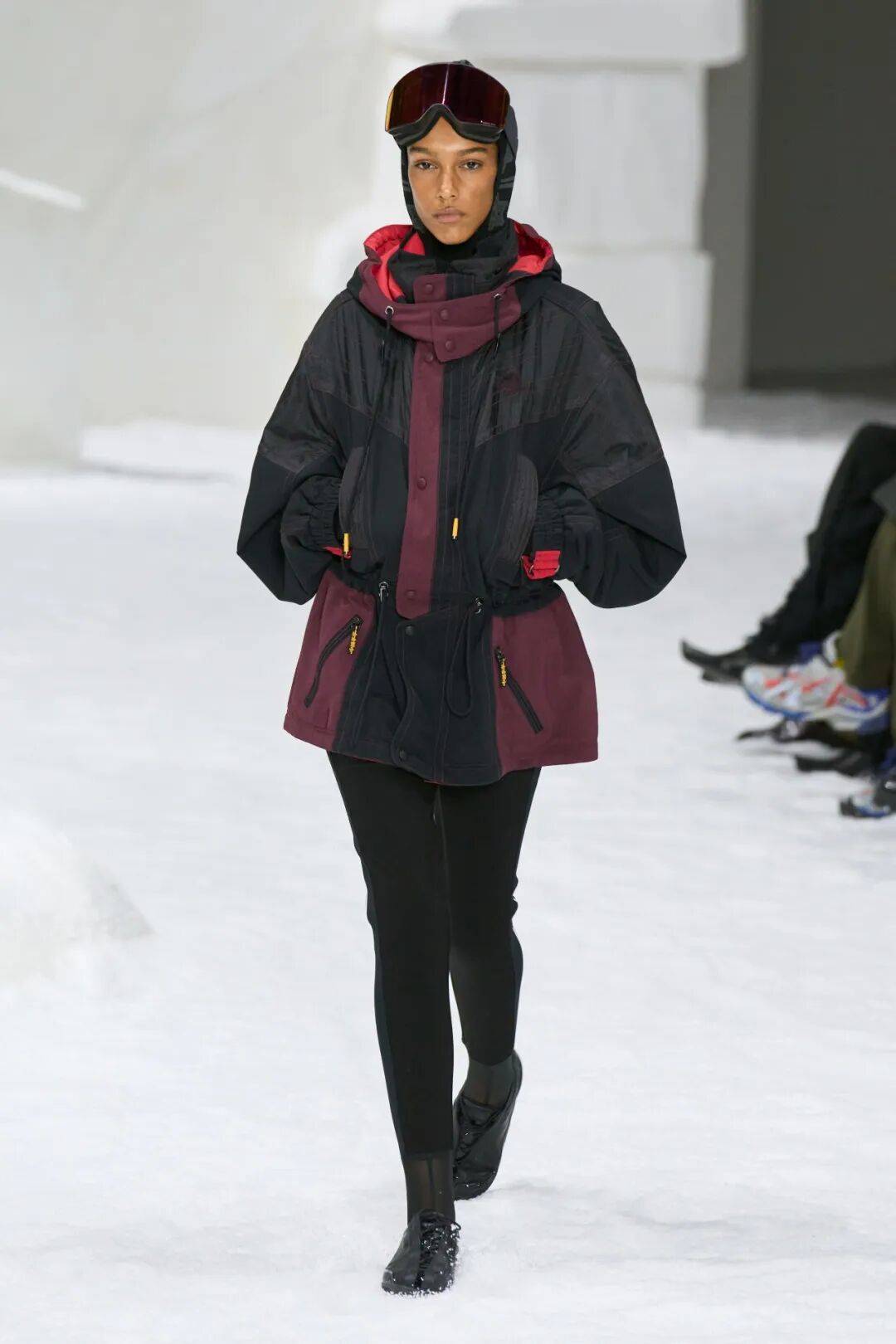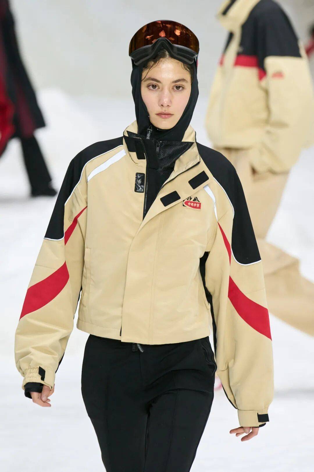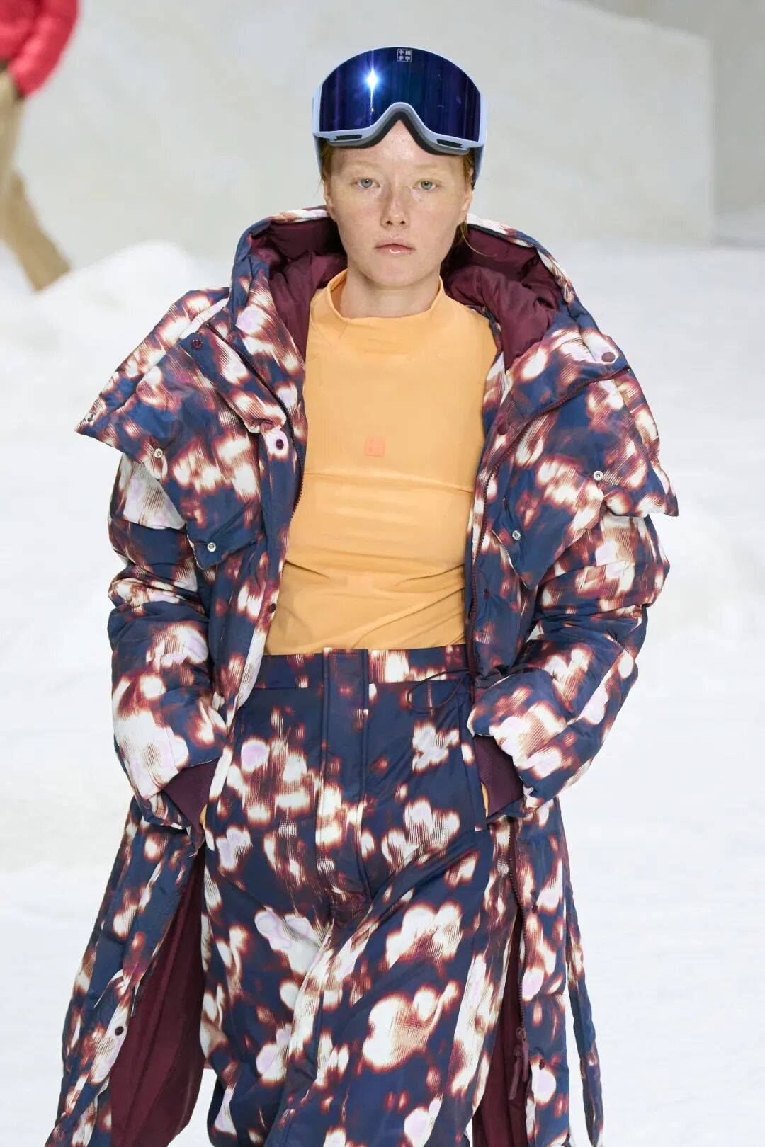 冰川纹理:通过银灰渐变提花面料、半透明TPU压层工艺,模拟冰山裂隙的立体感;服装裁片采用几何切割设计,呼应冰川崩解意象。