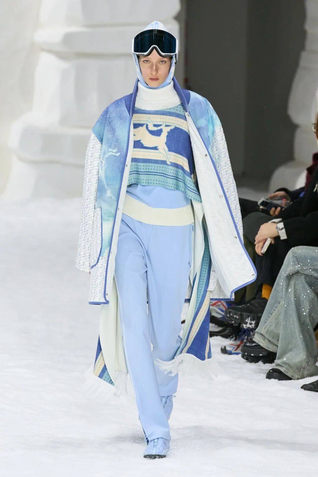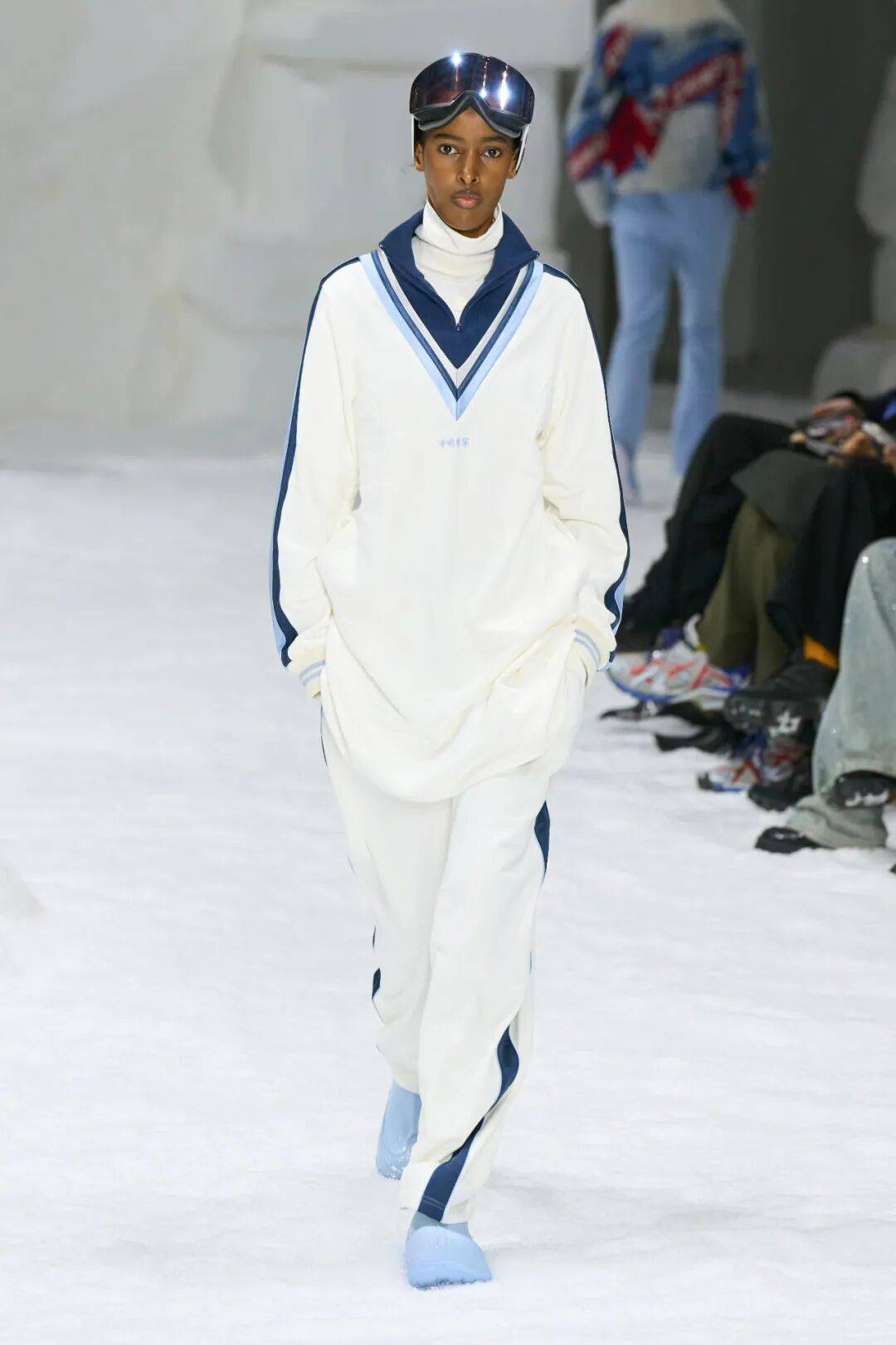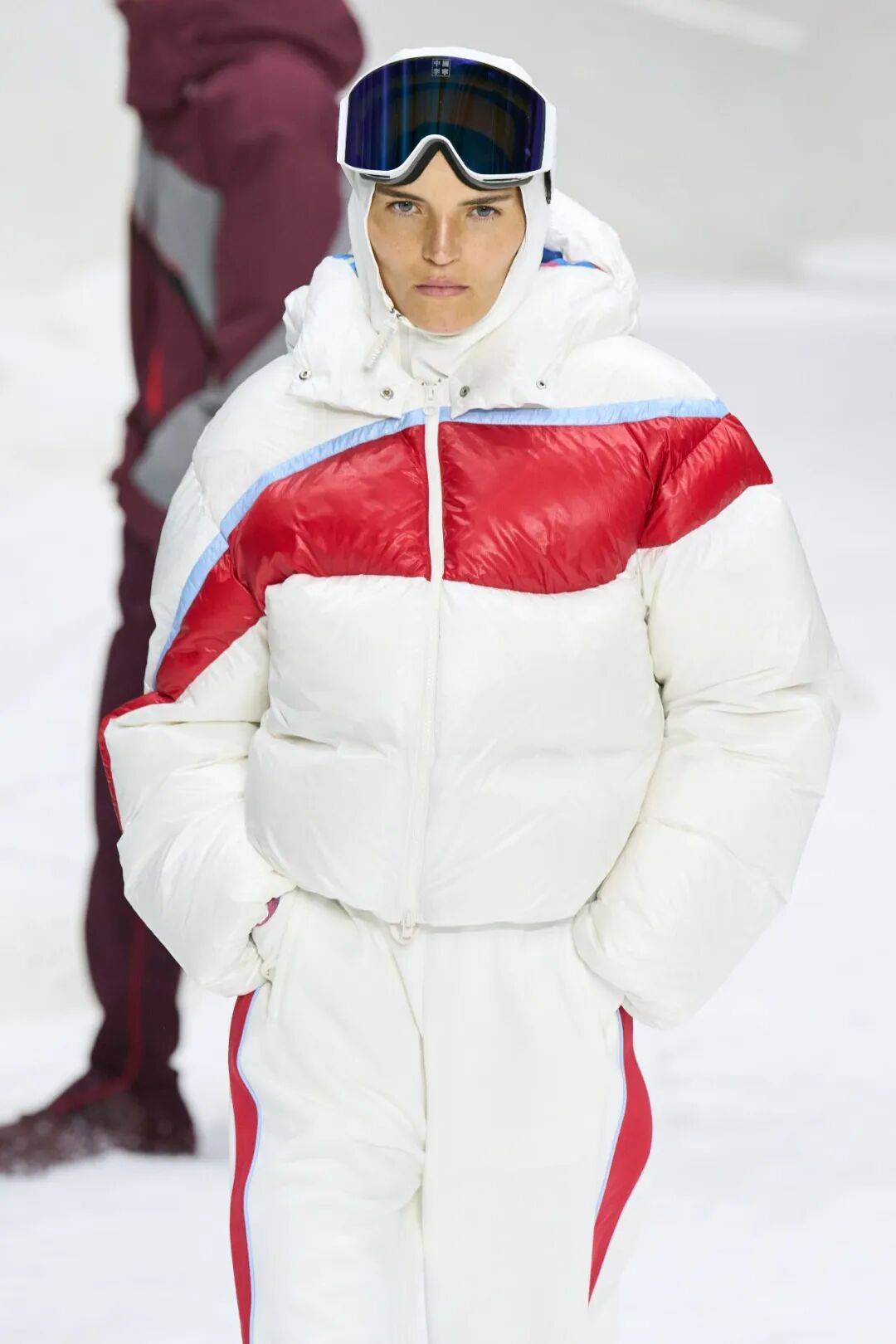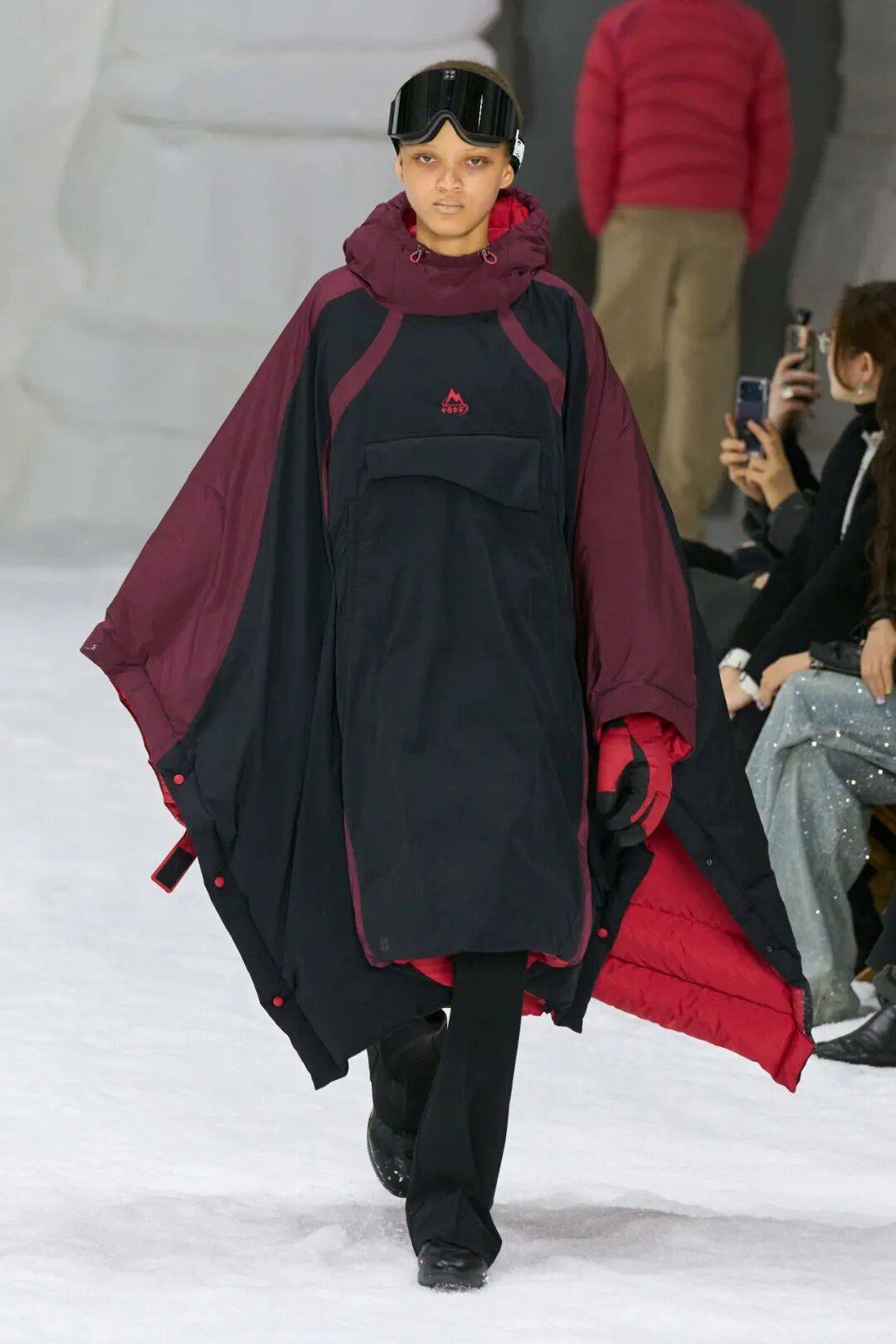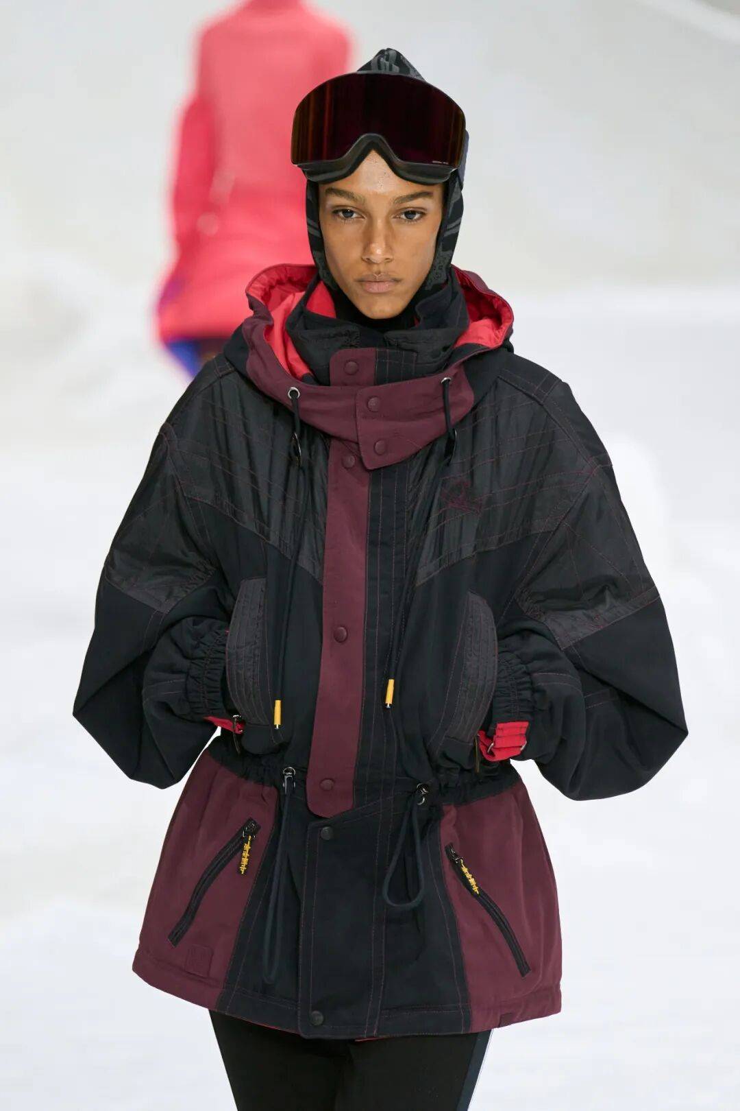 冰川纹理:通过银灰渐变提花面料、半透明TPU压层工艺,模拟冰山裂隙的立体感;服装裁片采用几何切割设计,呼应冰川崩解意象。