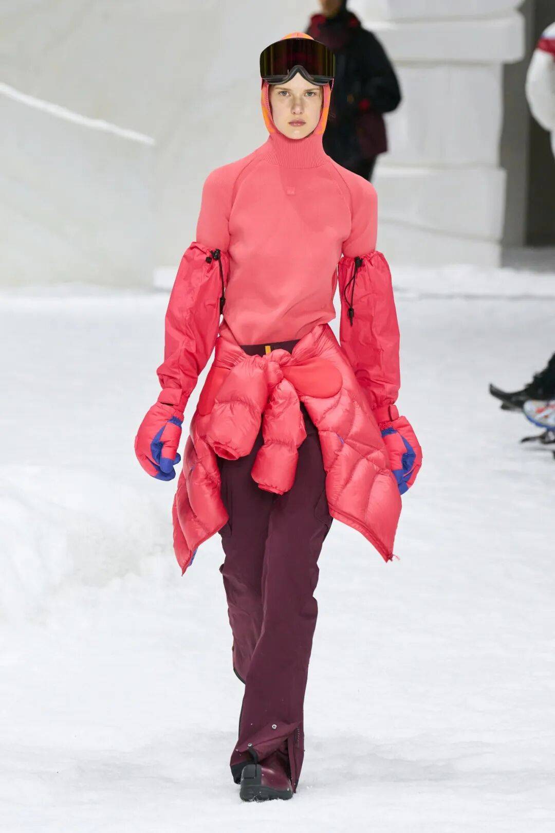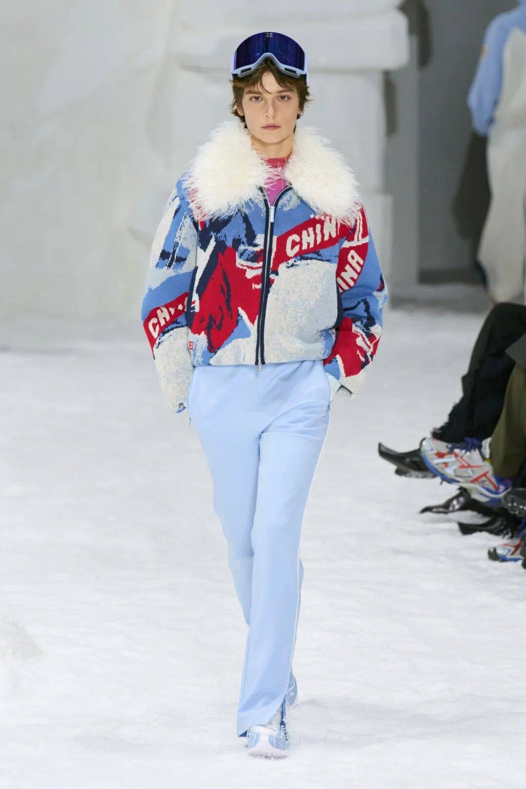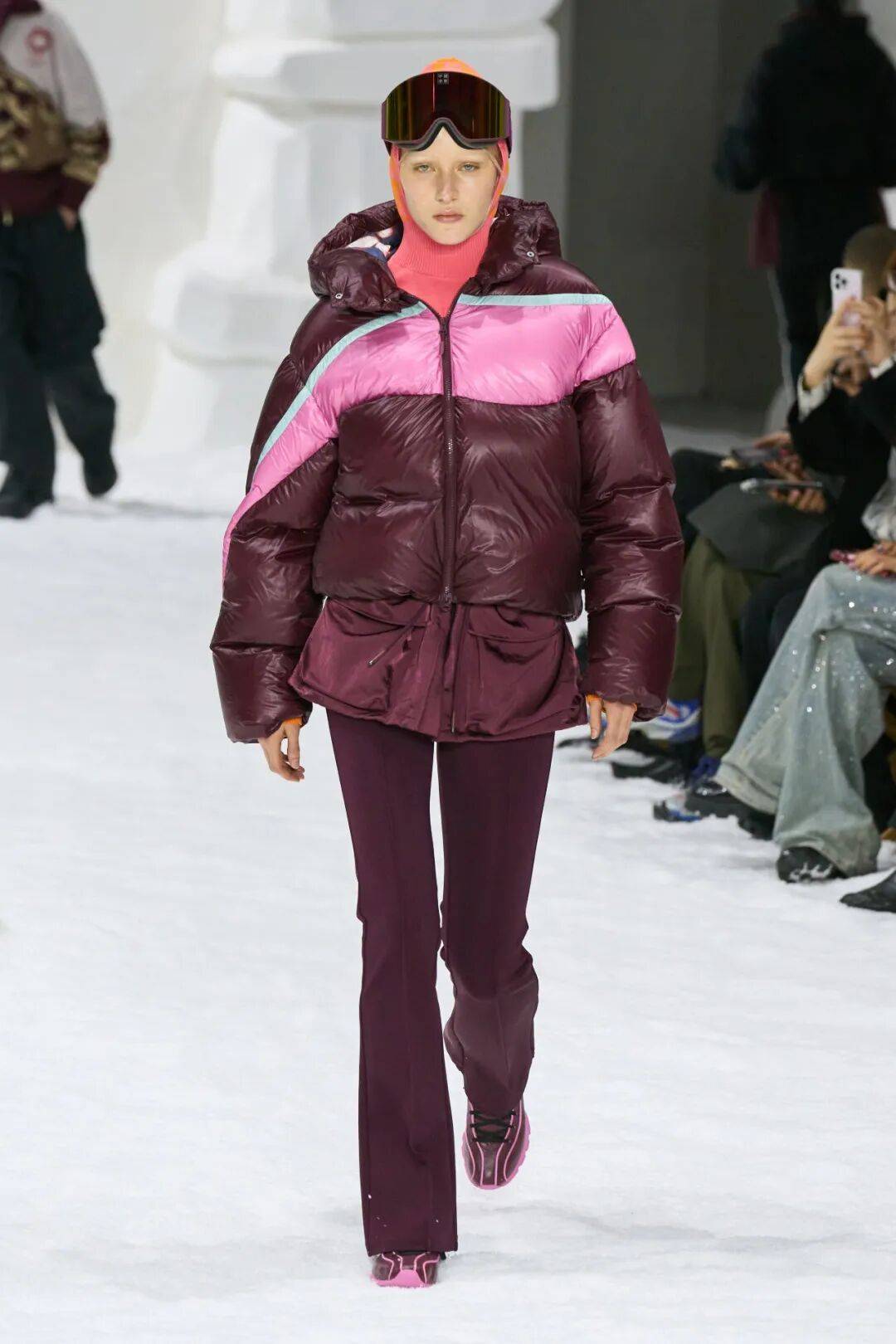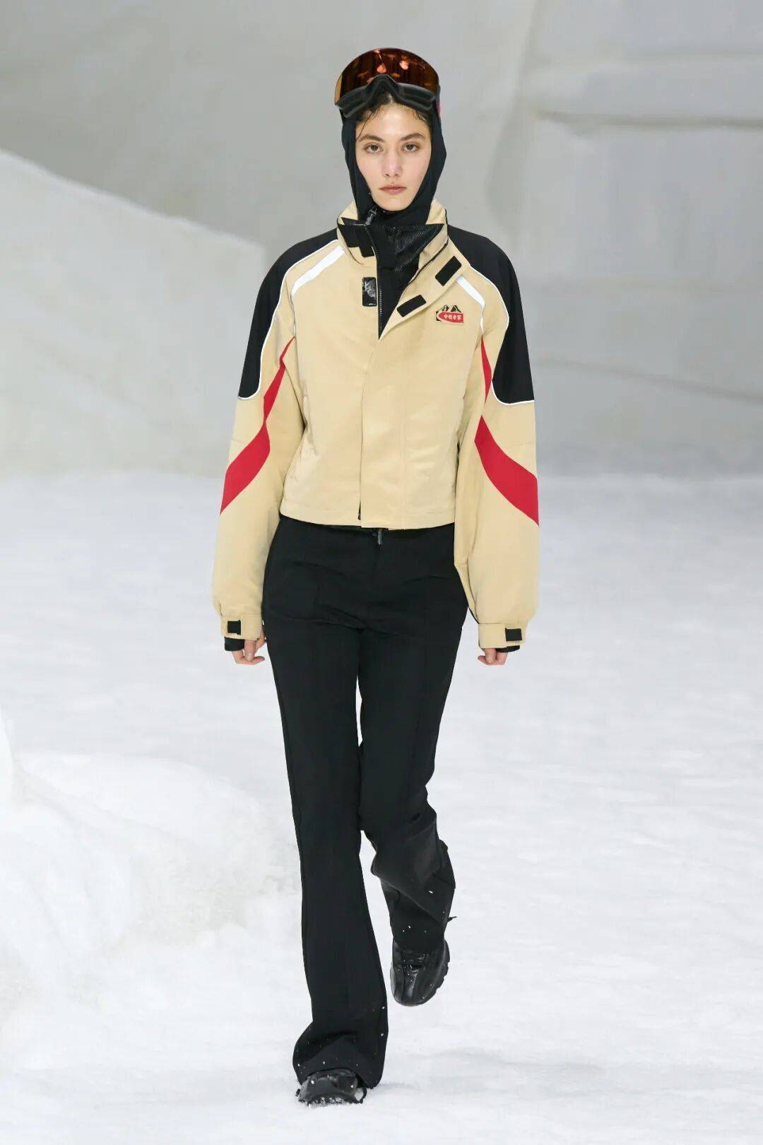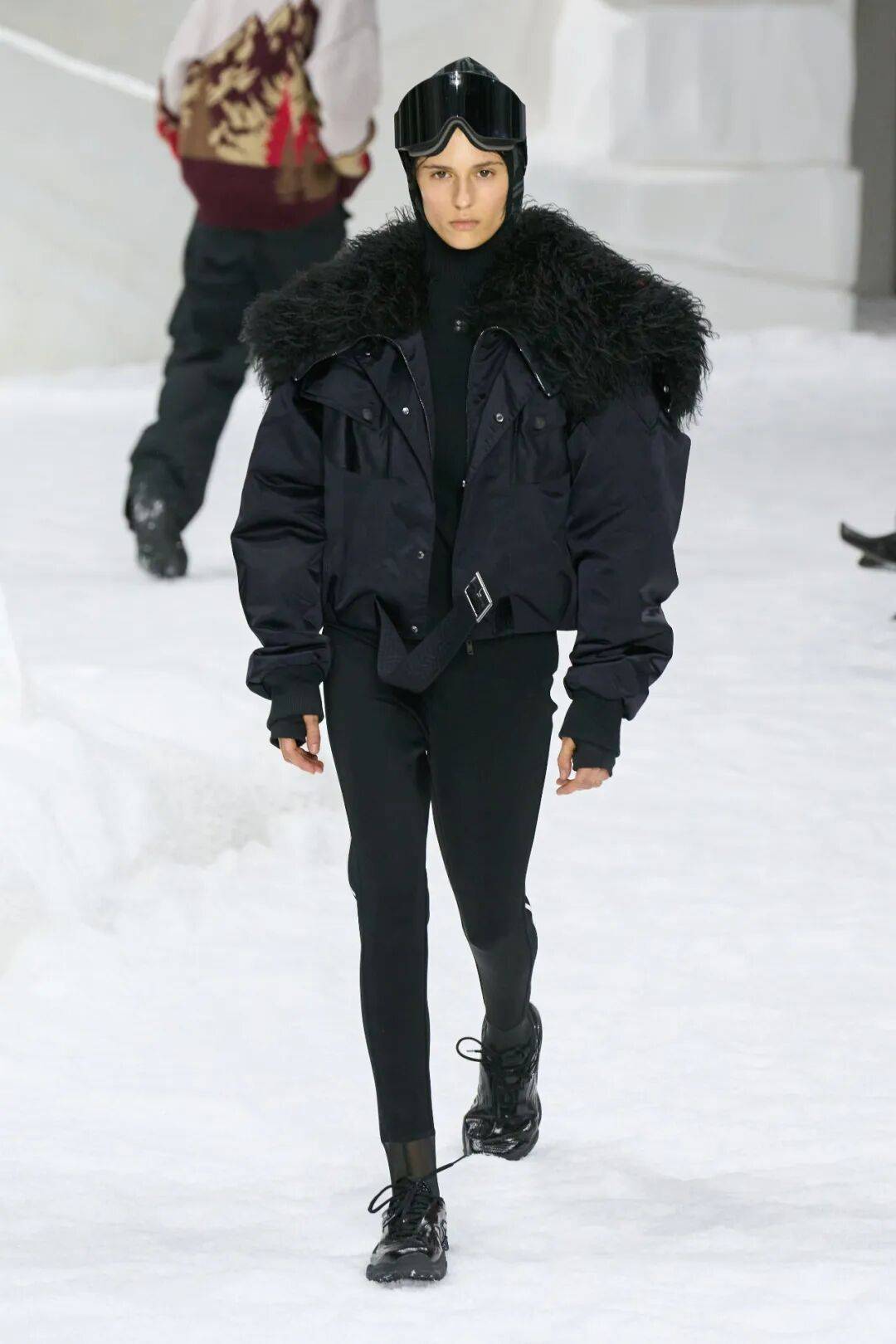 冰川纹理:通过银灰渐变提花面料、半透明TPU压层工艺,模拟冰山裂隙的立体感;服装裁片采用几何切割设计,呼应冰川崩解意象。
