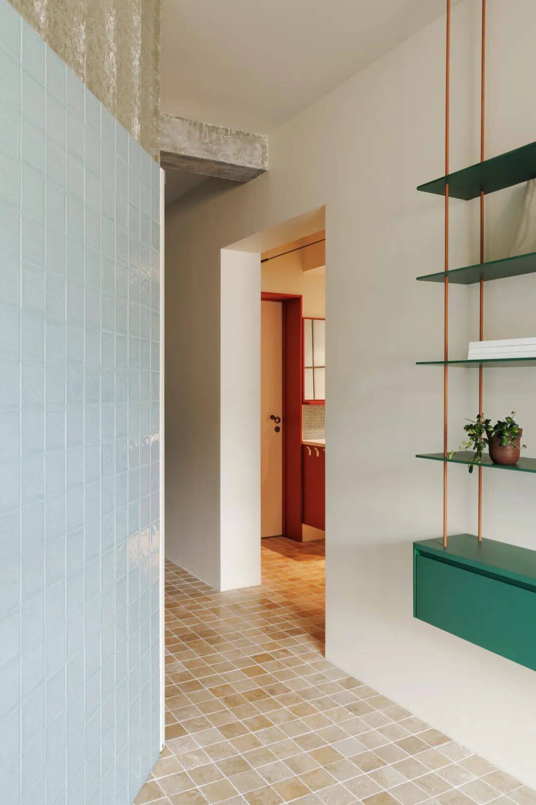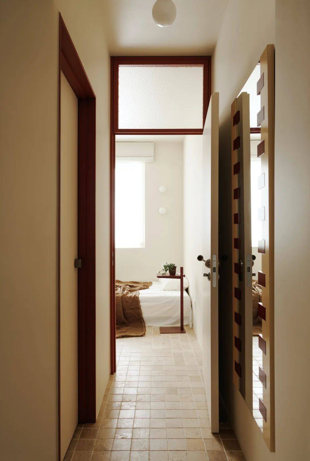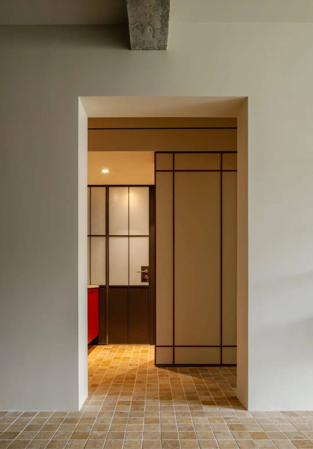 将原有笔直入户通道改为45°折线型,两侧墙面覆45°微倾镜面不锈钢。行走其中,天井光经多次反射形成流动光带,同时镜面延伸视觉纵深,使95㎡产生“120㎡尺度幻觉”。更重要的是——折线路径天然形成三代人的“视线缓冲带”:老人坐在玄关矮凳上,视线被45°镜面柔和折射,既可观察入门者,又避免直视带来的压迫感。