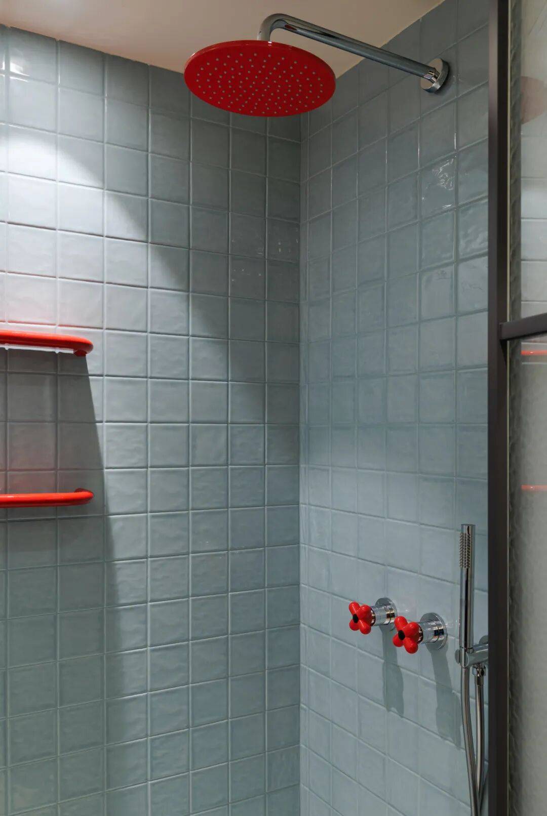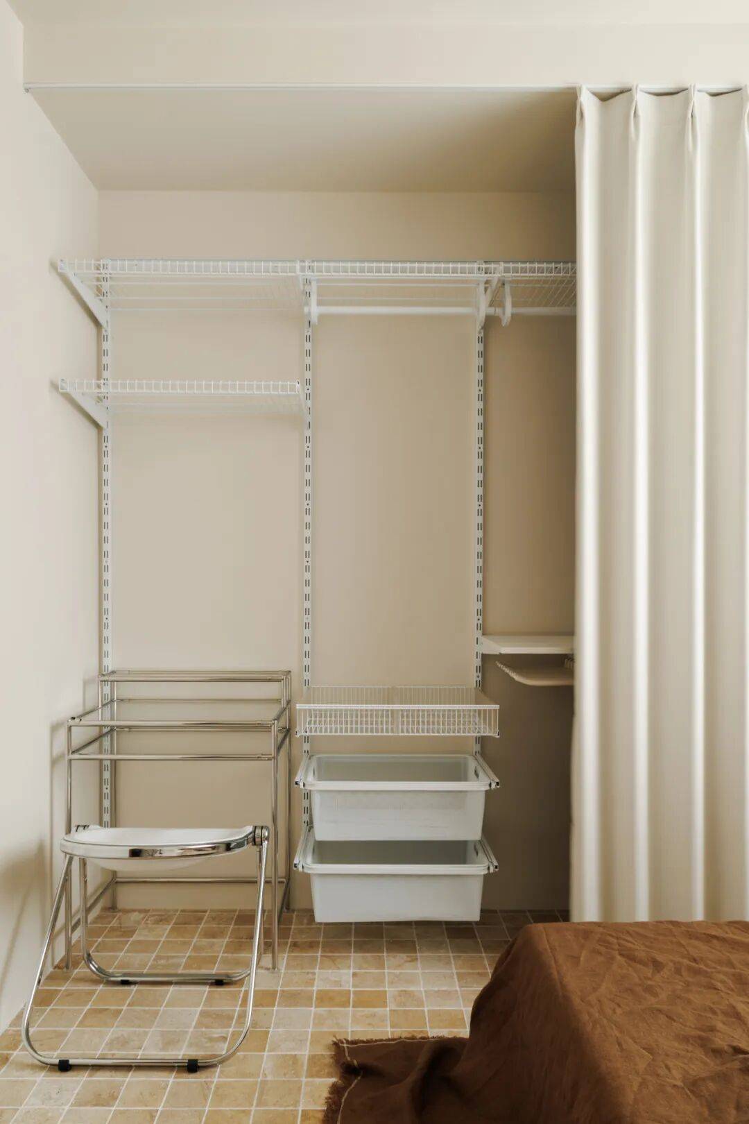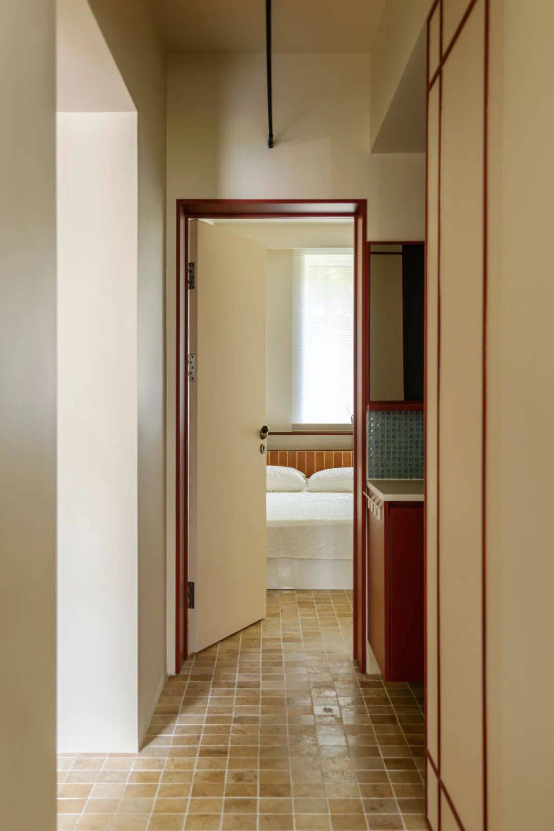 将原有笔直入户通道改为45°折线型,两侧墙面覆45°微倾镜面不锈钢。行走其中,天井光经多次反射形成流动光带,同时镜面延伸视觉纵深,使95㎡产生“120㎡尺度幻觉”。更重要的是——折线路径天然形成三代人的“视线缓冲带”:老人坐在玄关矮凳上,视线被45°镜面柔和折射,既可观察入门者,又避免直视带来的压迫感。