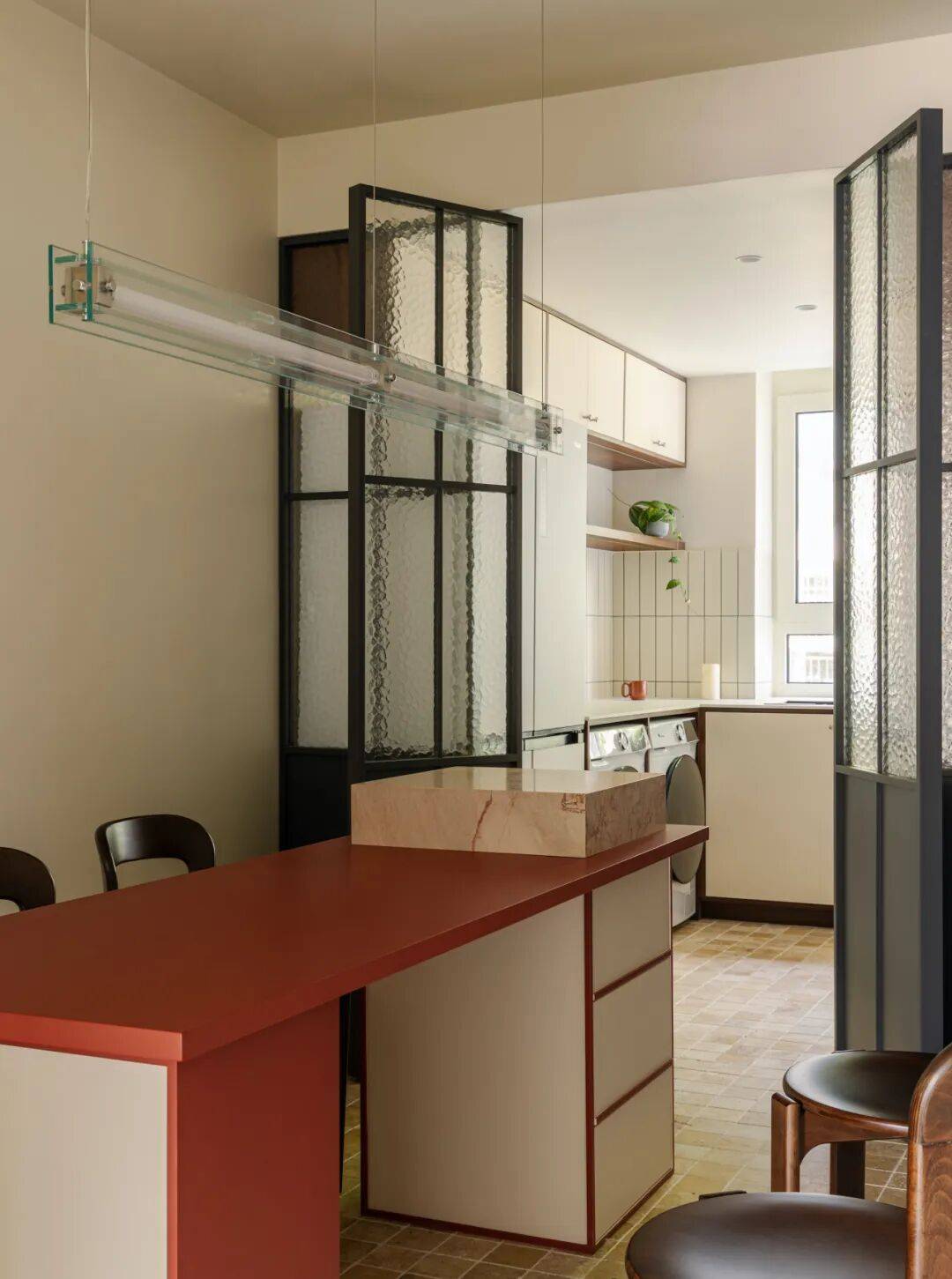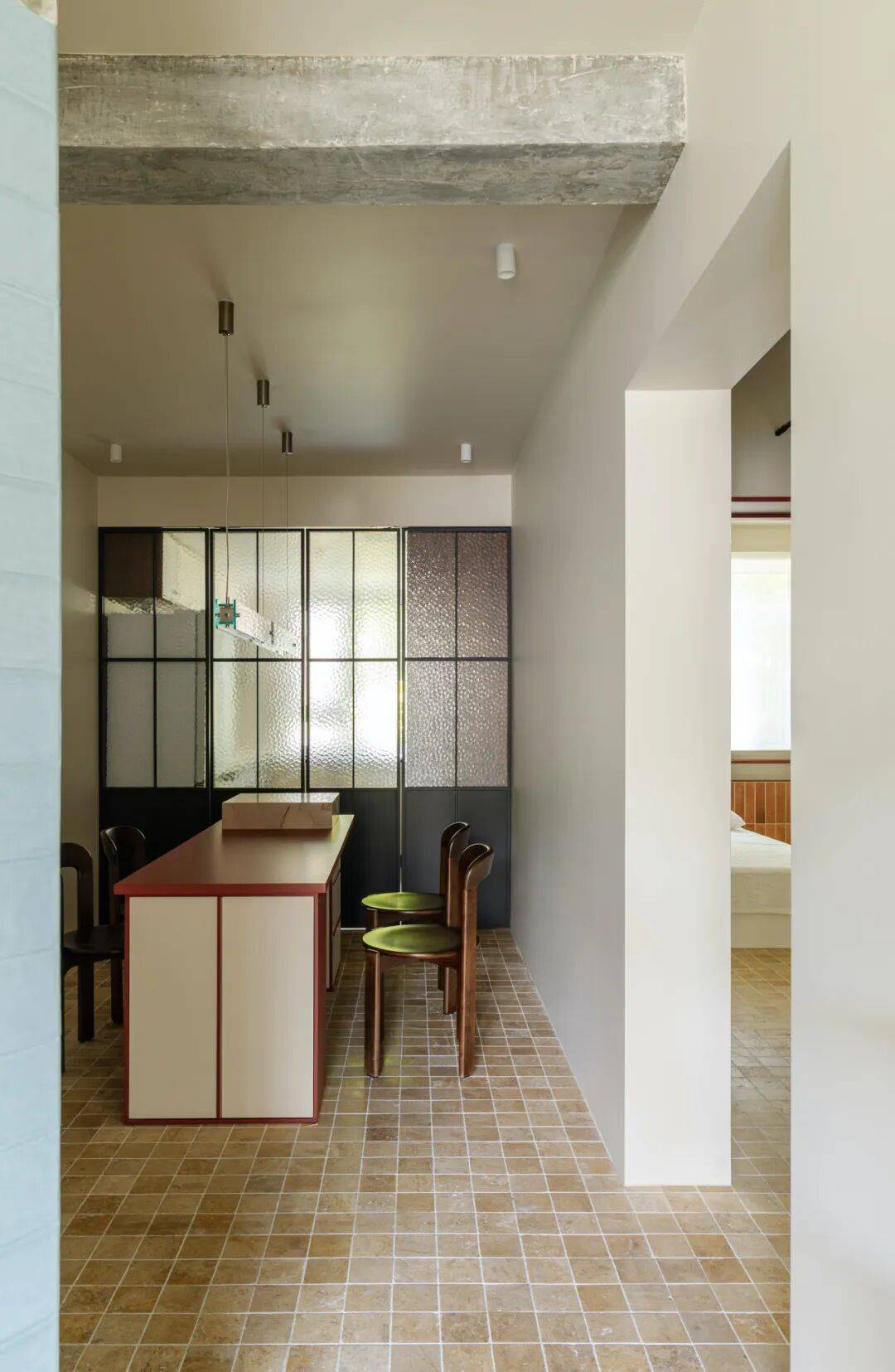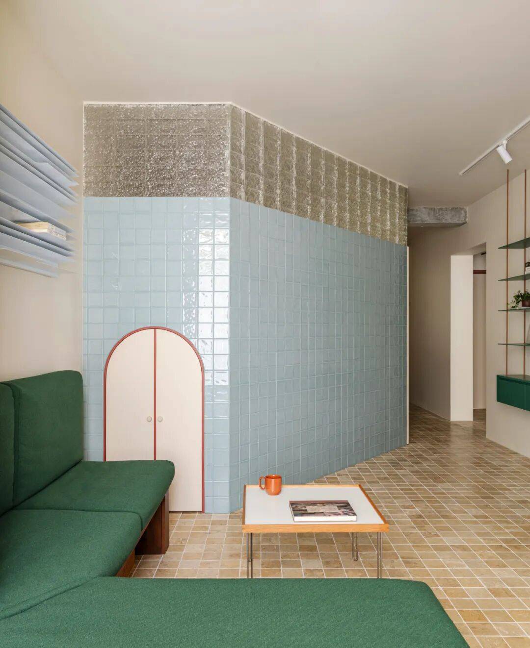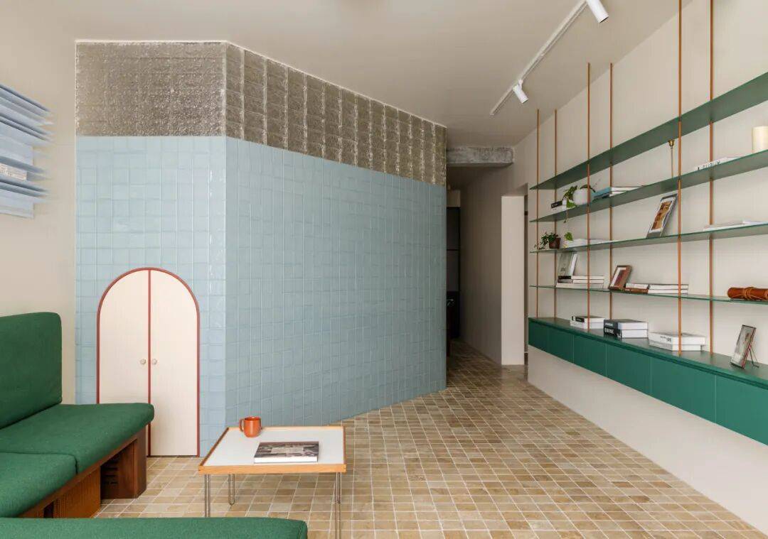 在厨房与餐厅交界处,以45°玻璃砖砌筑半通透隔断。做饭时,天光穿过玻璃砖形成朦胧光晕,映照在妻子侧脸;丈夫在餐桌批改试卷,抬头可见光晕中妻子忙碌的剪影——45°的暧昧角度,让辛劳日常升华为诗意凝望。