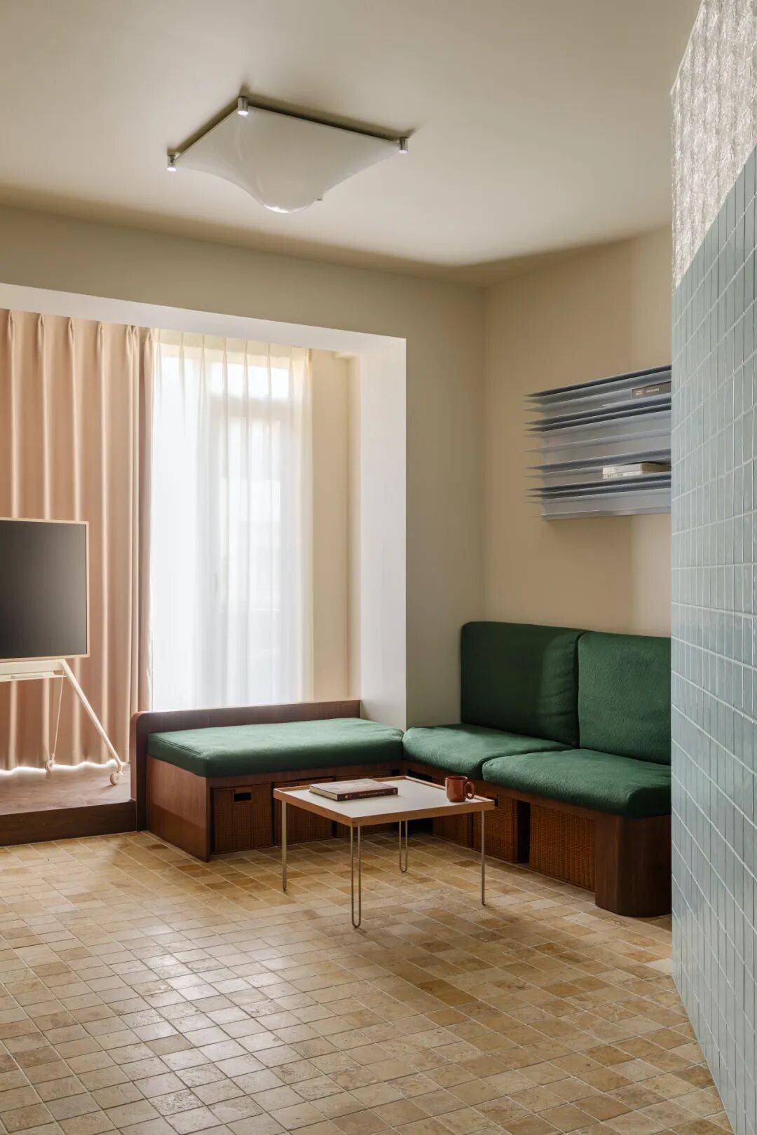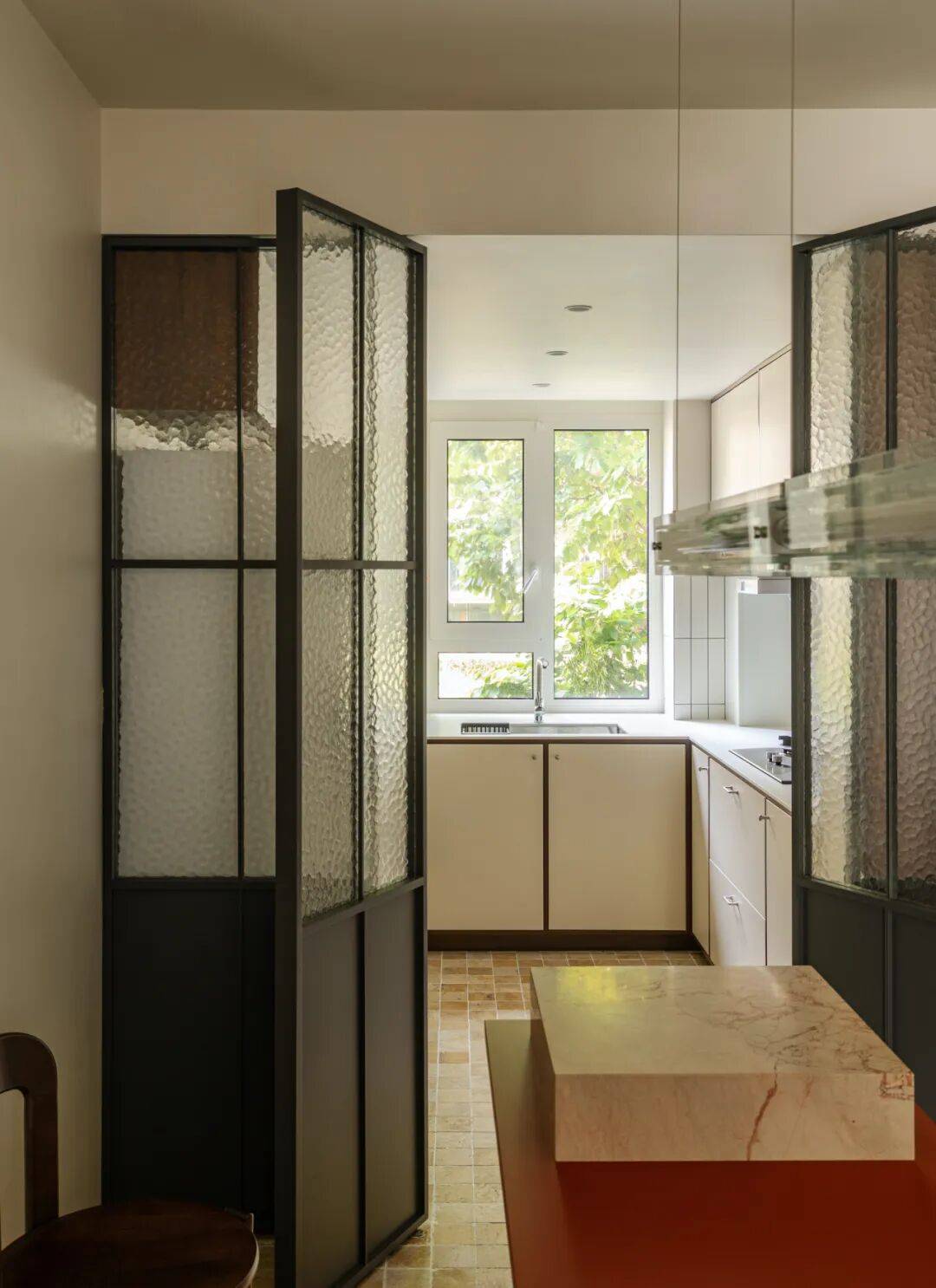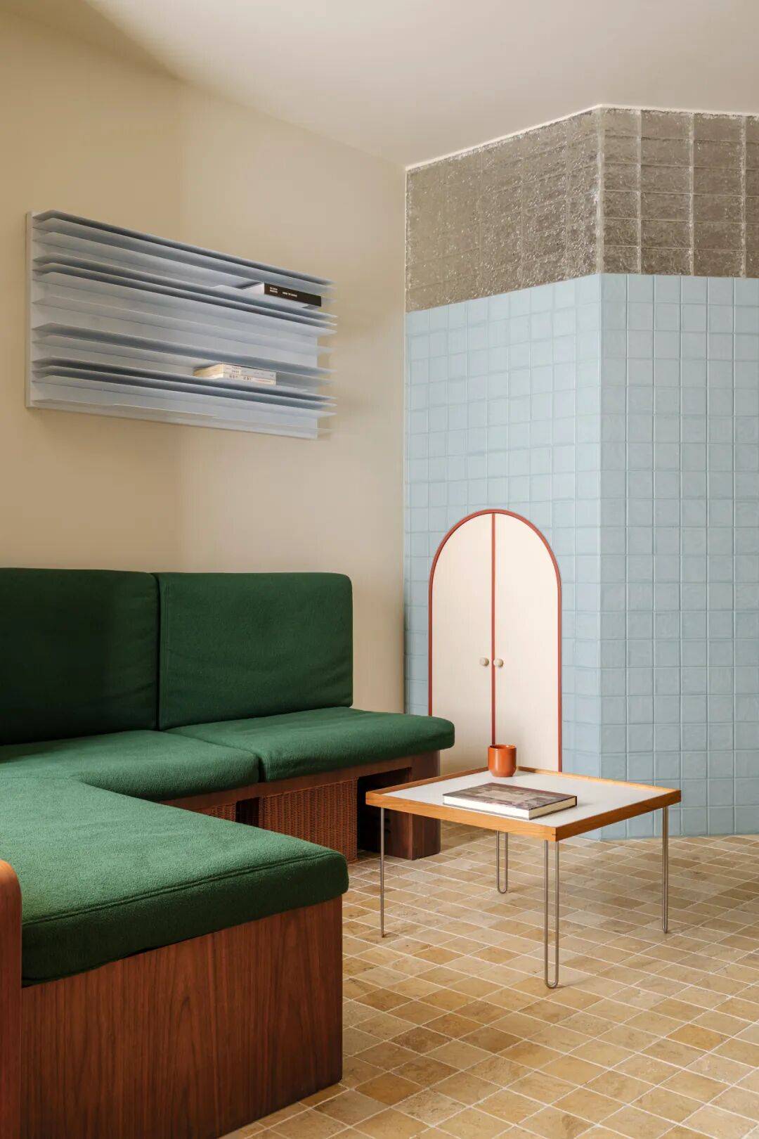 在厨房与餐厅交界处,以45°玻璃砖砌筑半通透隔断。做饭时,天光穿过玻璃砖形成朦胧光晕,映照在妻子侧脸;丈夫在餐桌批改试卷,抬头可见光晕中妻子忙碌的剪影——45°的暧昧角度,让辛劳日常升华为诗意凝望。
