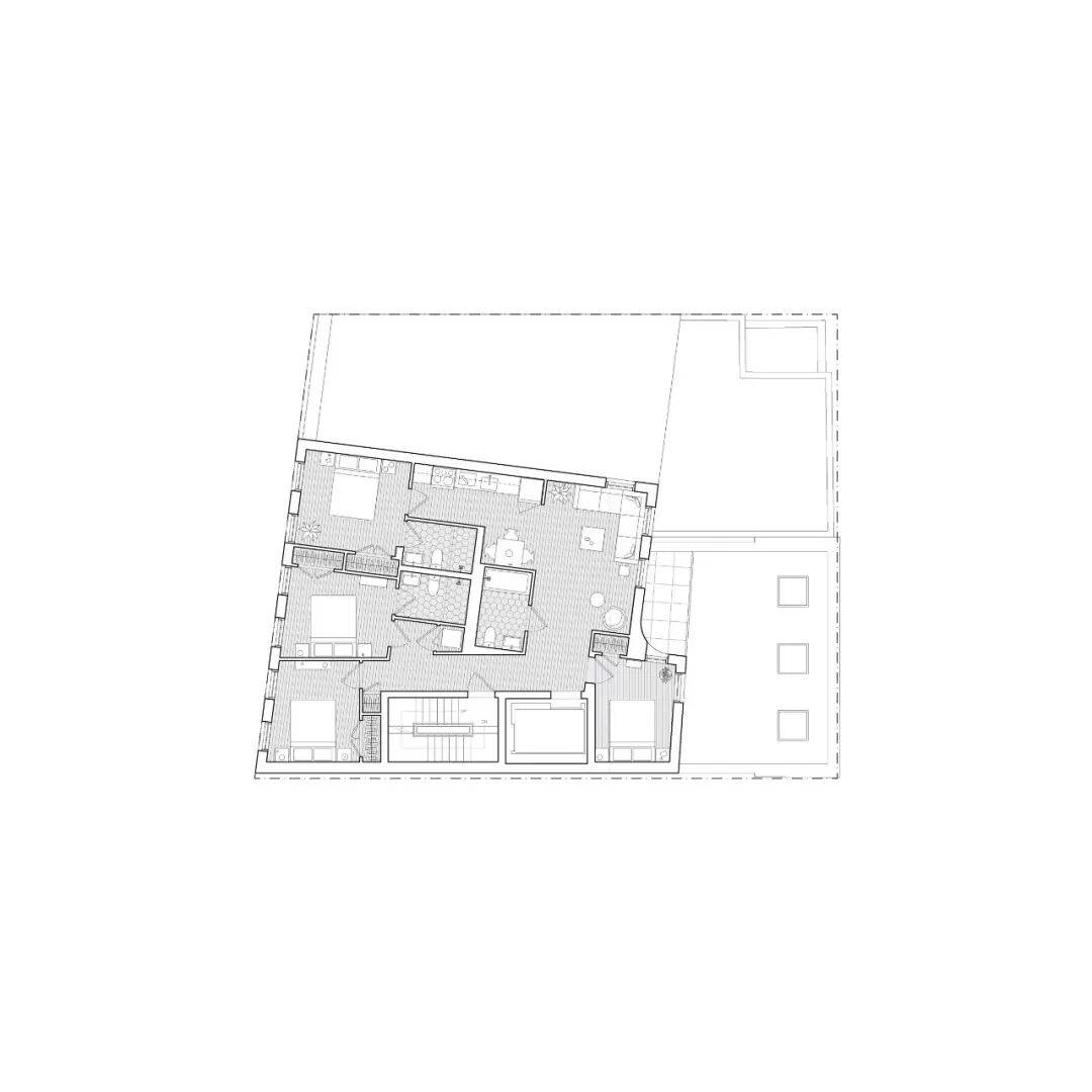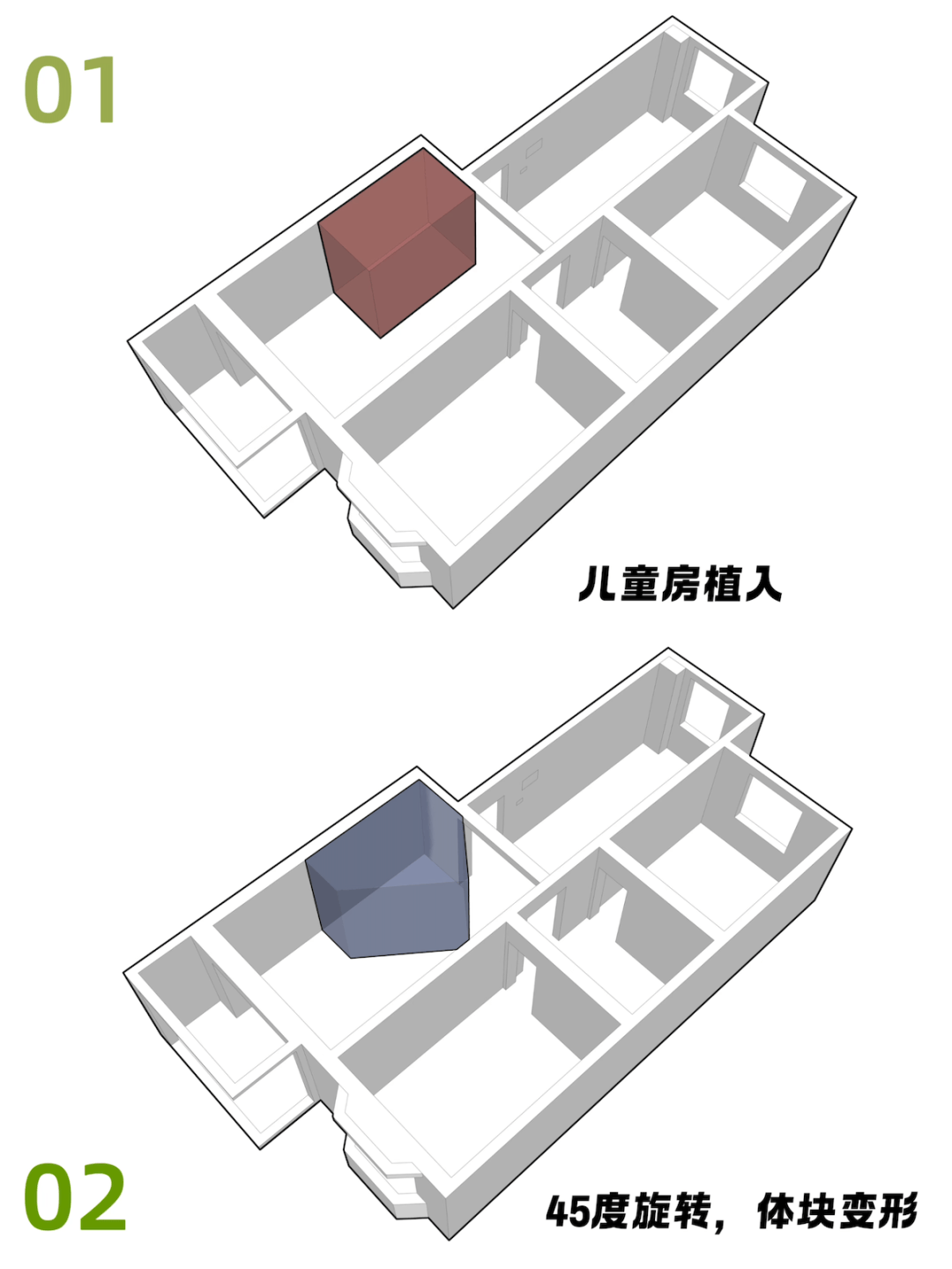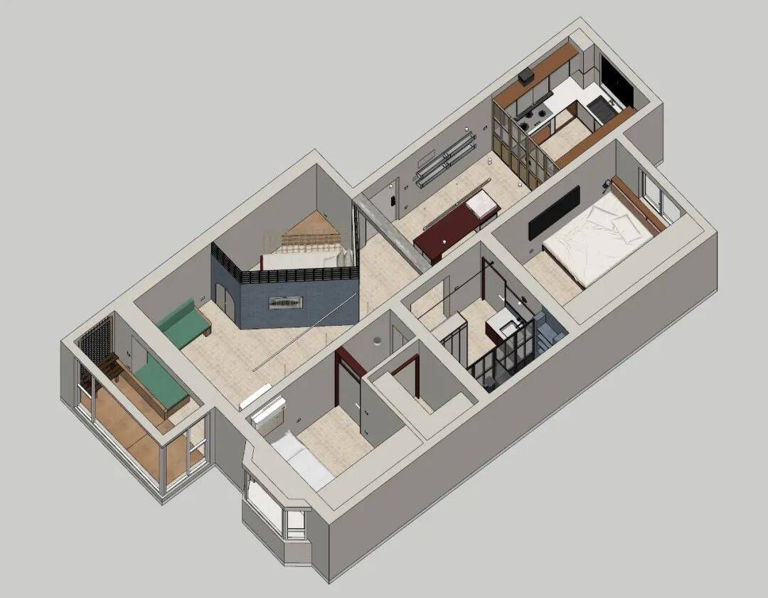 在客厅与老人房之间设置45°旋转书架墙。白天,书架呈45°打开,成为共享阅读角,天光穿透书脊间隙洒落双区;夜间,书架旋转90°闭合,形成隔音屏障。此界面非简单隔断,而是代际关系的物化装置——可开可闭、可透可隐、可共处可独处。