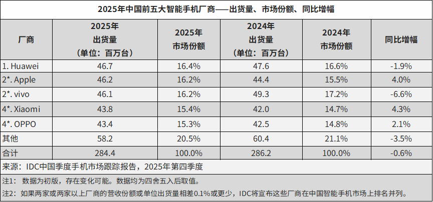 根据IDC数据,2025年全年,华为手机出货量重回中国市场第一,但其出货量相比去年同比下降约2%,与市场大盘整体降福基本持平。