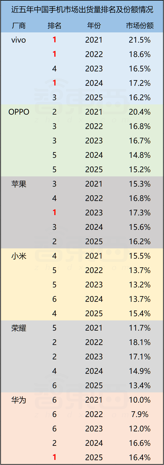 Counterpoint、Omdia、IDC等主流市研机构给出的2025年全年中国手机市场出货量TOP3均为华为、苹果、vivo,由于vivo和苹果的出货量极为接近,因此基本上可以看作并列第二。