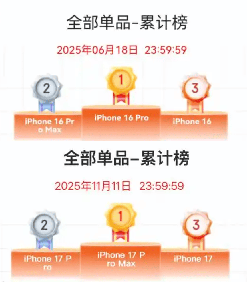 ▲2025年618、双11大促期间,苹果始终包揽手机单品销量TOP3,来源:京东