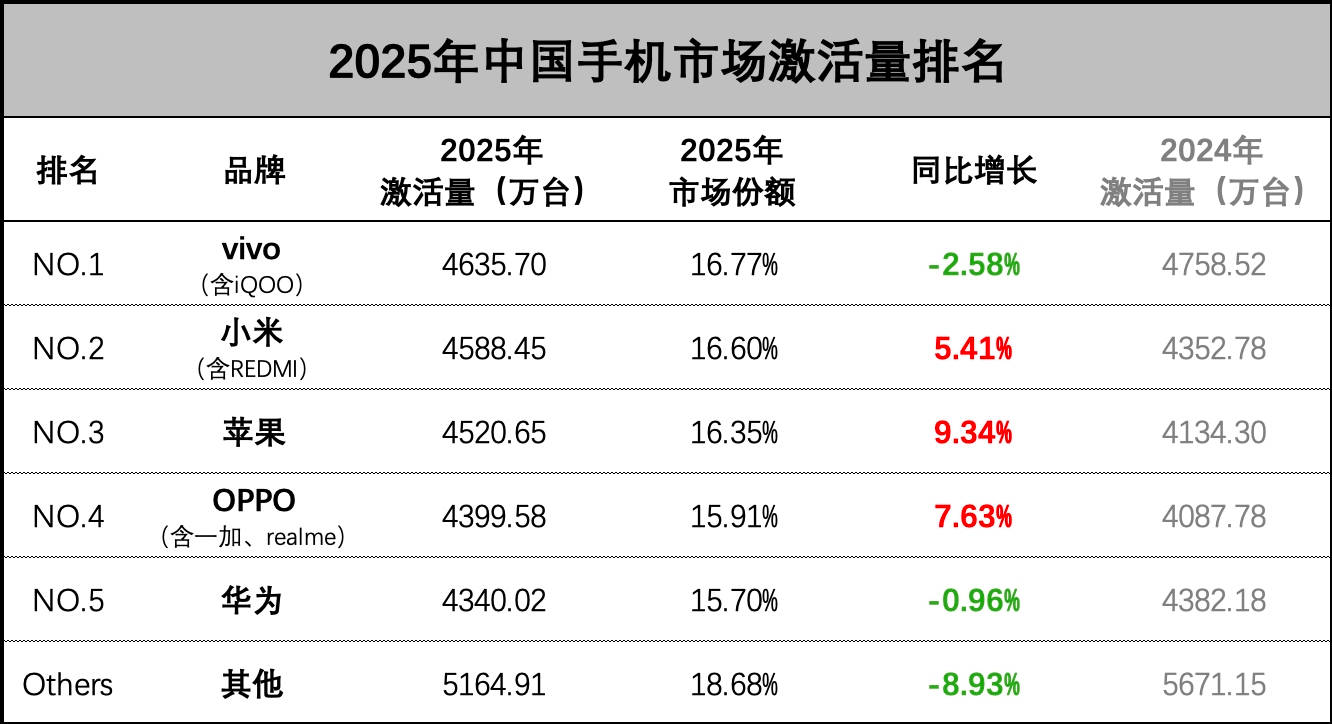 激活量第五:实际激活量排名中,华为跌至第五,vivo、小米、苹果位列前三,激活量与出货量差距超300万台,暗示库存积压风险。