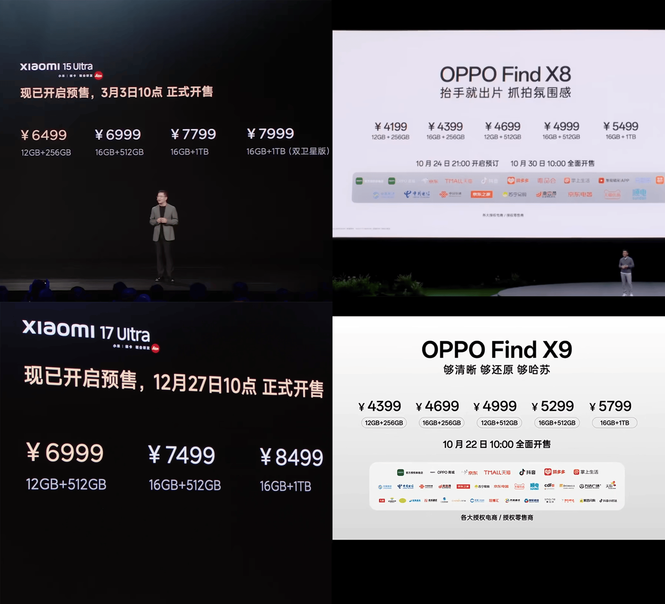 在存储价格猛涨的2025年,不少厂商的旗舰机型都进行了一定的价格上调,尤其是大容量存储版本涨价幅度更大,比如小米17 Ultra 16GB+1TB版本相比上代同规格机型贵了700元,vivo X300系列512GB、1TB版本相比上代贵了300元,OPPO Find X9系列512GB、1TB版本也比上代贵了300元。