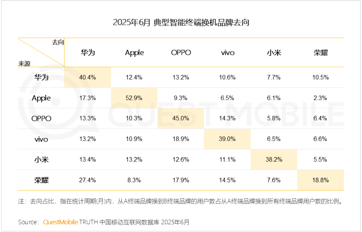 2025年6月,Quest Mobile曾发布一份数据,从品牌忠诚度的角度来看,华为用户的忠诚度较高,仅次于苹果和OPPO,品牌回购比例超过四成,荣耀用户中有27.4%在换机时选择华为。