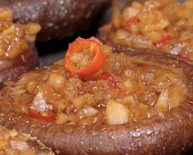 2、再倒入剩下的蒜和小米辣,略微翻炒即可关火。新鲜香菇洗净去蒂,锅里放5ml油,黑色一面向下放入锅里小火慢煎,表面撒一小撮盐便于入味。香菇稍微变软后翻一面继续煎到完全变软。香菇碗状一面向上,把炒好的蒜蓉酱淋入,撒上孜然。出锅后撒少许香葱提味