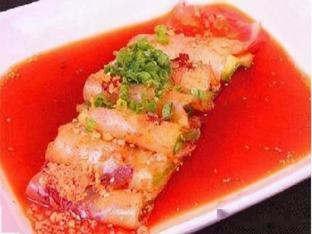 2、取一片黄牛掌,上面盖上两片黄瓜,对叠后摆入盘中,依次摆放6组,浇入红油汁,撒香葱末10克即成。