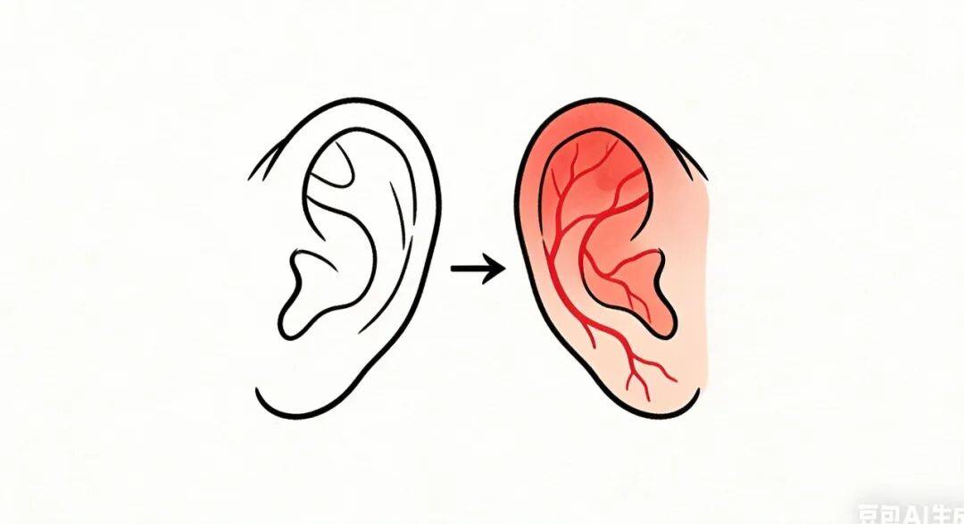 人体血管系统受自主神经和体液调节以维持血压稳定,而耳廓血管对此类变化尤为敏感。当血压升高时,动脉内压力增强,血流对耳部血管壁的冲击力增大,由于耳部血管纤细,这种动力学变化会更明显地被感知甚至显现。